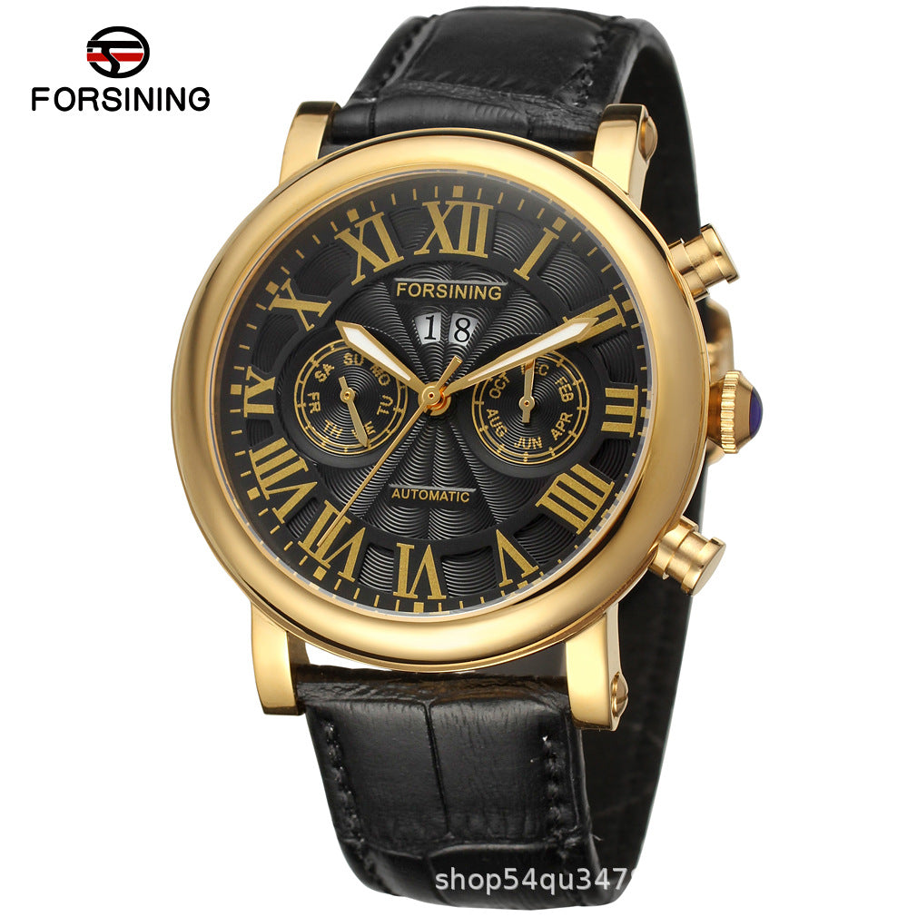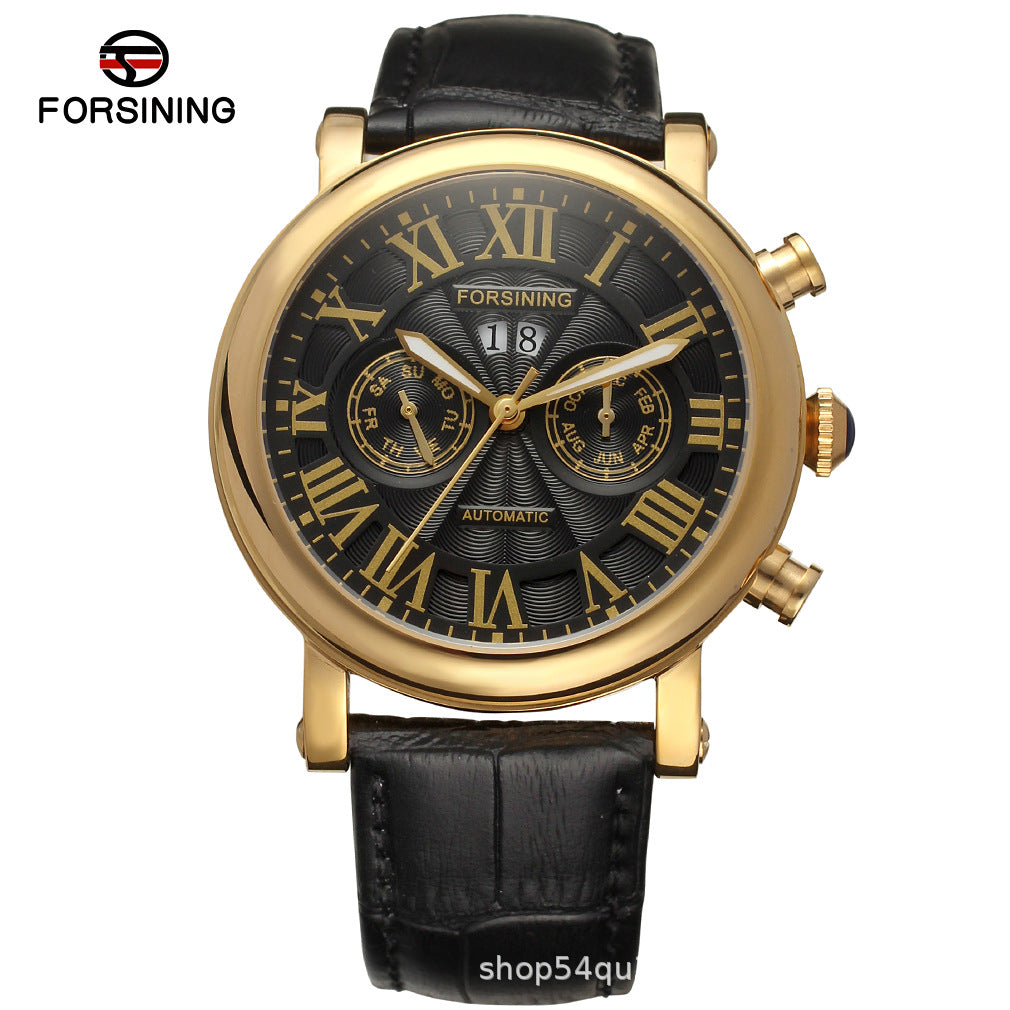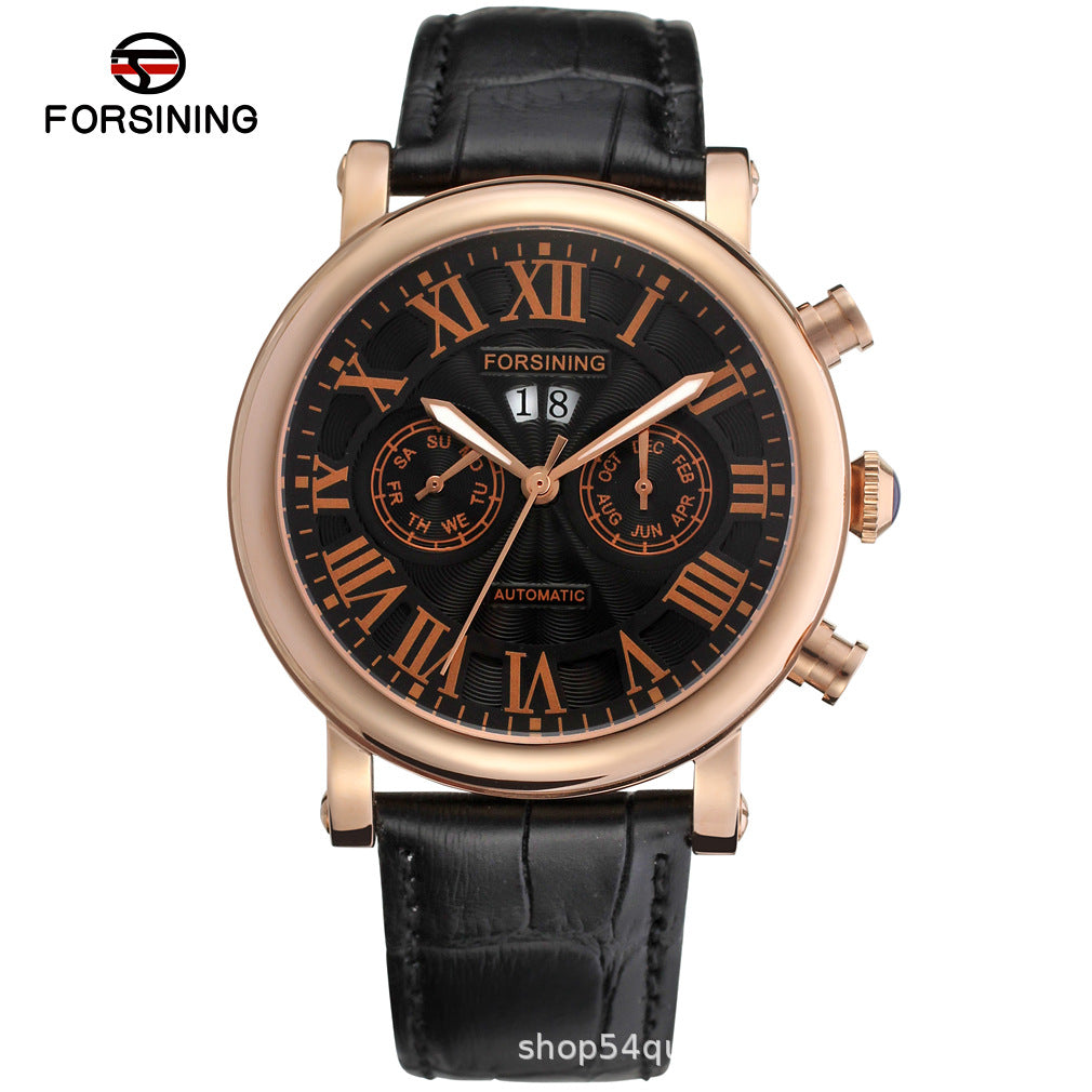 Refine your wristwear with the FORSINING Men's Multi-Function Mechanical Watch — a stylish blend of performance and elegance. This automatic timepiece features a five-needle display with Roman numeral markers and built-in calendar, week, and month functions, offering both form and function.