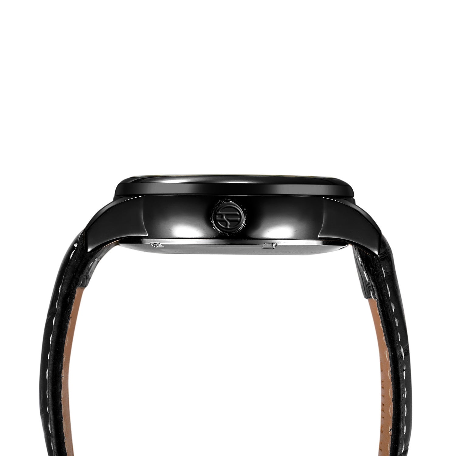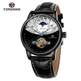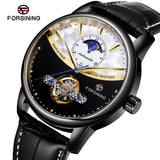 This men's automatic mechanical watch blends classic style with advanced timekeeping features. The round 43mm alloy case showcases a flywheel tourbillon movement and sun-moon phase display, all protected by a mineral reinforced glass mirror. Designed for those who appreciate functional sophistication, it features a world time function, a transparent case back, and a stylish leather strap with a stainless-steel pin buckle.
