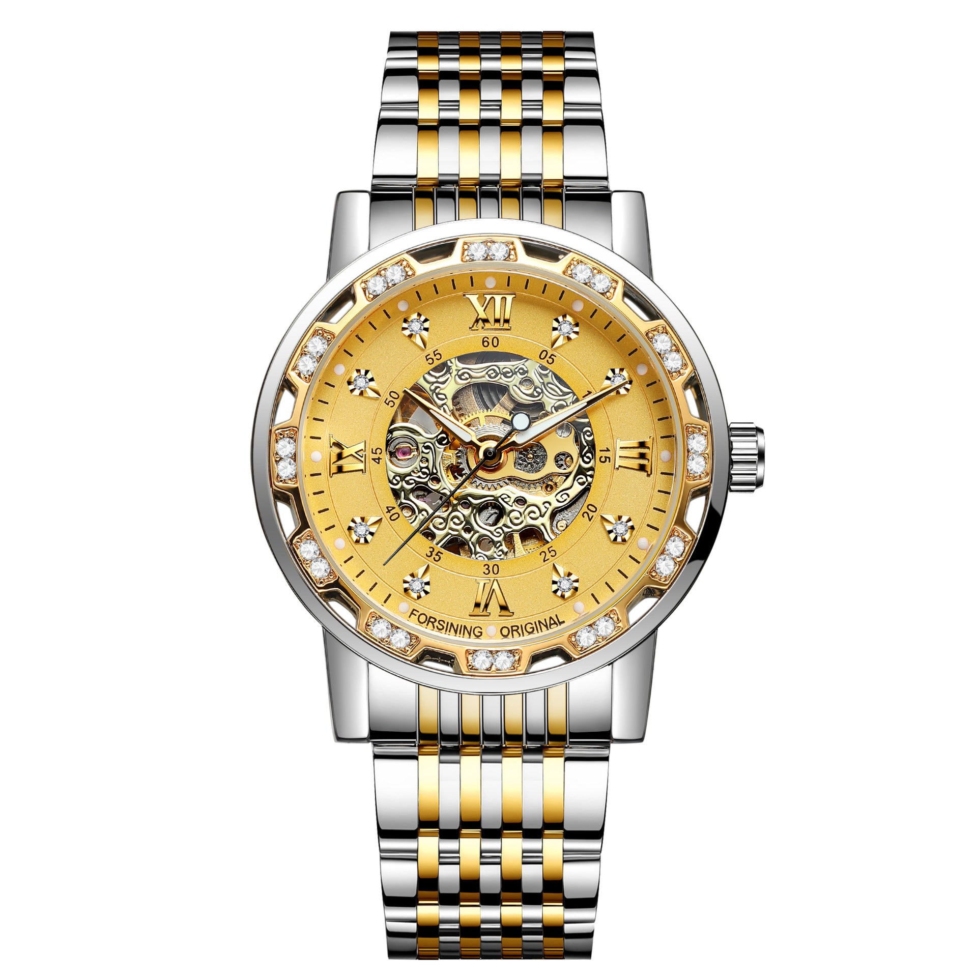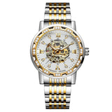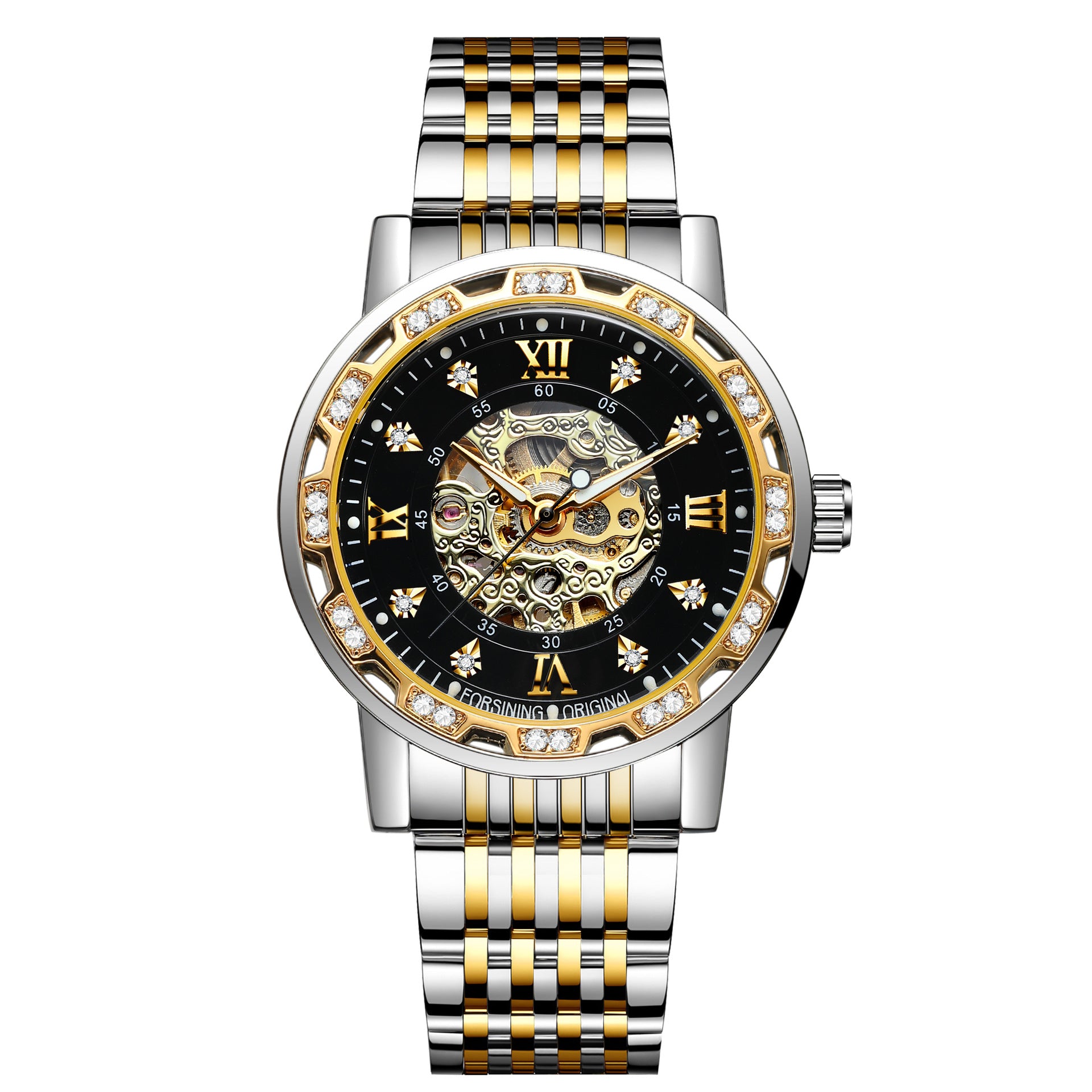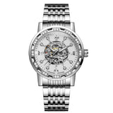 Elevate your accessory game with this automatic skeleton watch for men, blending bold design with intricate craftsmanship. Featuring a 40mm dial framed by shimmering rhinestones, this timepiece showcases a hollow mechanical movement through a transparent case back—perfect for those who appreciate timeless engineering.