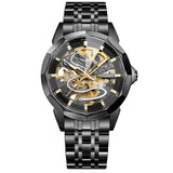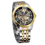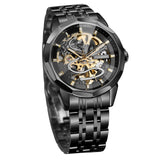 The mechanical movement ensures precision timekeeping without batteries, while the transparent back showcases the intricate inner workings. A stainless steel strap with a butterfly double snap buckle provides a secure and polished finish.