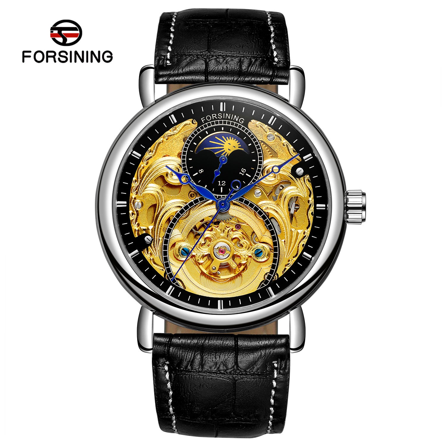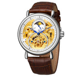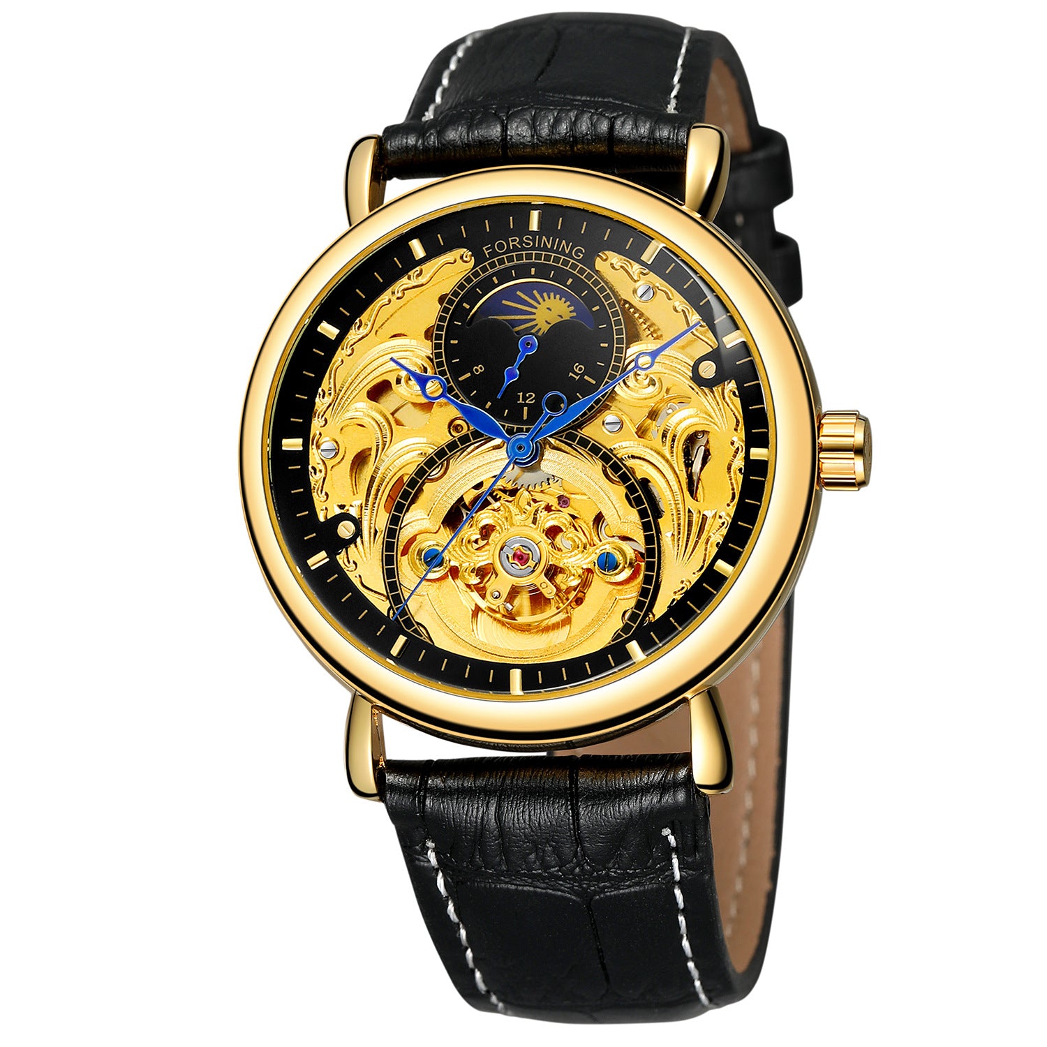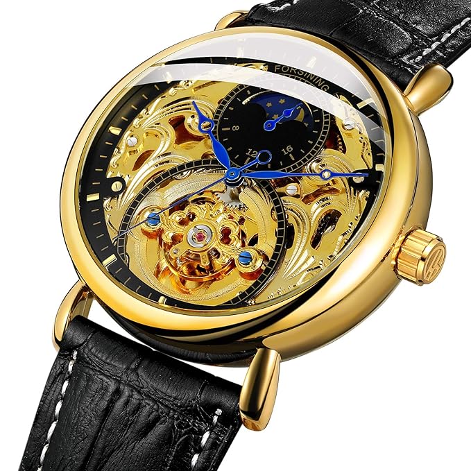 Elevate your wristwear with this stylish men's moon phase mechanical watch, blending classic European design with modern precision. Featuring a carved hollow dial and visible movement, this timepiece showcases a refined moon phase display that adds both beauty and function.