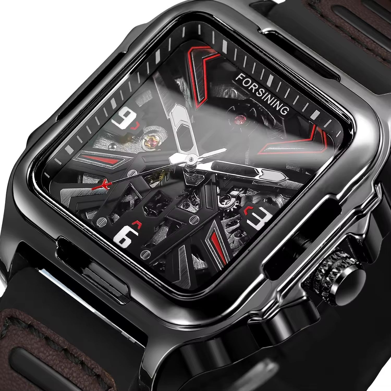 Make a bold statement with the Forsining Men's Square Mechanical Watch, designed for those who appreciate futuristic aesthetics and mechanical precision. Featuring a unique hollow "wormhole concept" dial, this timepiece adds a distinctive edge to your everyday look.