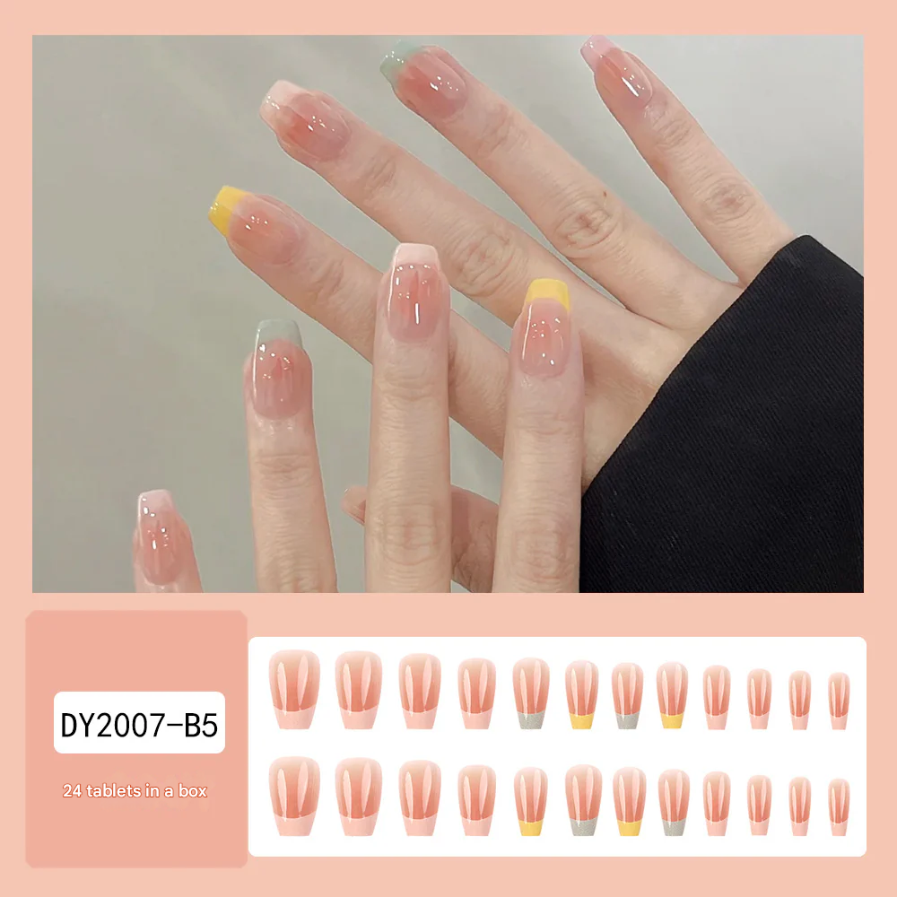 Bring effortless style to your fingertips with these French gradient press-on nails featuring soft nude and pastel tones with colorful tips. Designed in a chic square shape and medium length, they strike the perfect balance between trendy and wearable. Each set includes 24 acrylic nails, offering a comfortable fit and a professional salon-like finish that lasts. Easy to apply and remove, these glue-on nails are perfect for quick everyday glam or adding a polished touch to special occasions. The gradient design with playful tips gives your manicure a fresh, modern vibe without the hassle of polish or UV curing. Handpicked from Abroad, this set brings global nail art trends straight to your beauty routine, making it easy to switch up your style anytime.