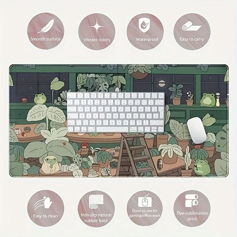 Elevate your workspace with this adorable kawaii frog desk mat, designed to blend charm and functionality. Measuring 35.4 x 15.7 inches, this large gaming mouse pad provides ample space for your keyboard, mouse, and other essentials. Its waterproof, non-slip rubber base ensures stability during use, while the smooth surface enhances mouse precision for gaming, work, or study. Crafted with durable dye-sublimation printing, the vibrant green frog design adds a playful touch to your office or home decor. Perfect for gamers, students, and professionals, this desk mat offers a comfortable, organized surface to boost productivity. Easy to clean and built to last, it’s a delightful addition to any desktop setup. Add a splash of personality to your workspace with this kawaii green desk accessory.