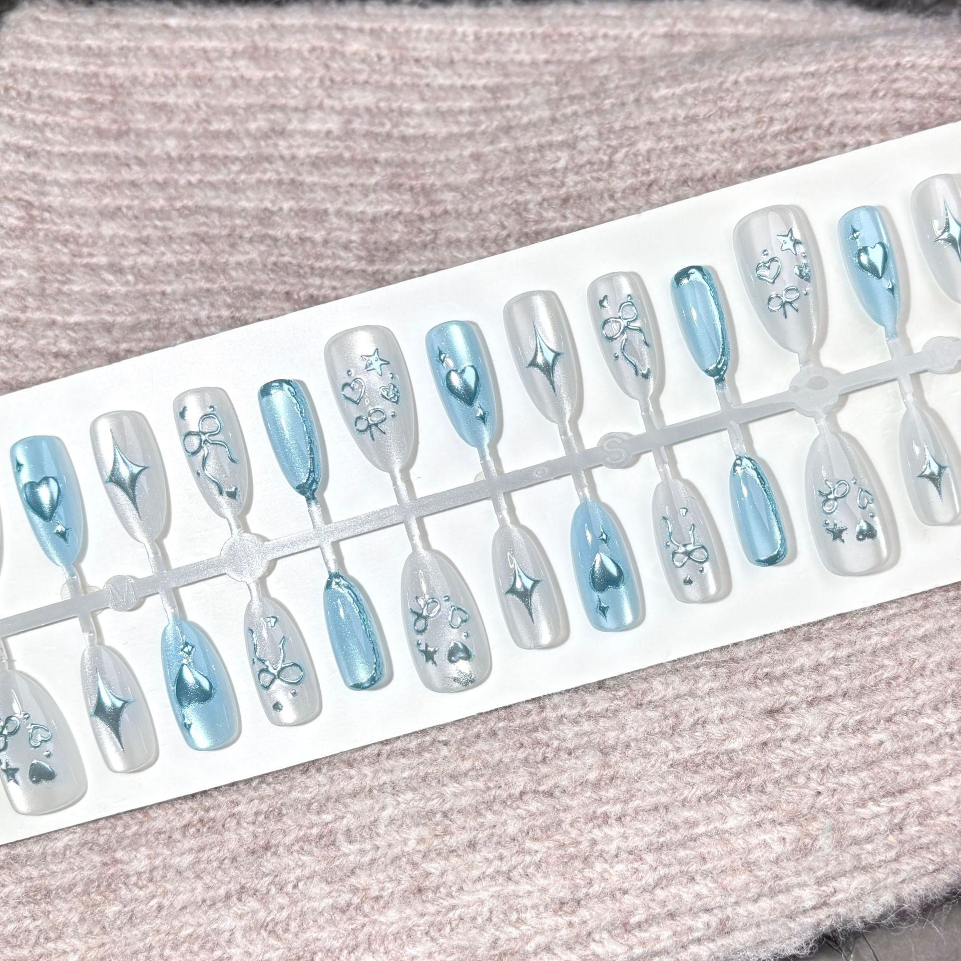 Elevate your manicure with these Glam Star Metallic Almond Press-On Nails. Designed in chic medium almond shapes, they feature a stunning metallic finish in shimmering silver and vibrant blue, accented with stars, hearts, bows, and sparkling details. Crafted from durable acrylic, these press-on nails offer long-lasting wear while remaining lightweight and comfortable for everyday use. Perfect for parties, special occasions, or adding a touch of glamour to your daily style, they provide an effortless salon-quality look at home. Easy to apply and remove, these nails are ideal for both beginners and nail enthusiasts. Handpicked from Abroad, this collection brings a global fashion-forward aesthetic straight to your fingertips. With a unique blend of elegance and fun, these metallic press-on nails let you shine and express your personal style effortlessly.