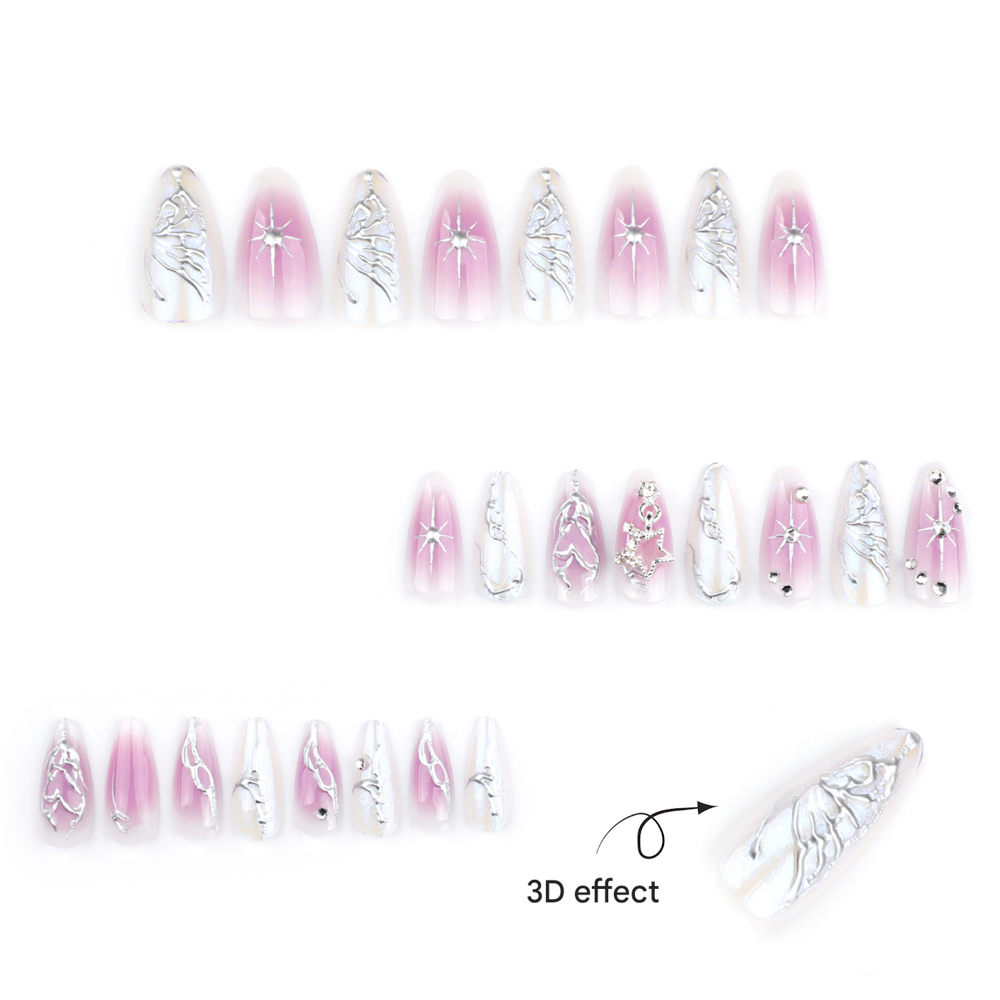 Elevate your nail game with these glossy 3D star coffin press-on nails, featuring a stunning pink and white gradient design. Crafted for a futuristic and elegant look, these long false nails add instant glam to any outfit. Easy to apply and remove, they come with adhesive tabs or nail glue options for a secure, comfortable fit. Perfect for those seeking quick, salon-quality nails without the hassle. Handpicked from Abroad, this set combines high-quality craftsmanship with trendy abstract patterns, making your manicure truly stand out. Whether for special occasions or everyday wear, these press-on nails deliver lasting beauty with effortless style. Experience the convenience and sophistication of premium press-on nails designed to boost your confidence and charm.