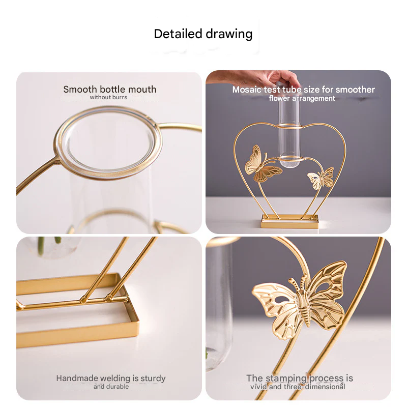 Add a touch of timeless elegance to your home with this Gold Butterfly Flower Vase, designed to showcase stunning faux flower arrangements in style. Crafted from durable metal in a rich gold finish, this vase features a delicate butterfly detail and comes in round, hexagon, and heart shapes—perfect for accenting desktops, dining tables, or console areas. Its open-frame hydroponic design gives it a modern light luxury feel while offering a graceful display for artificial blooms that never wilt. Ideal for everyday decor or special occasions, it creates a fresh, floral ambiance without any upkeep. Whether you're upgrading your space or searching for a thoughtful gift, this elegant vase is sure to impress. Sourced from Worldwide Suppliers, it blends European charm with practical beauty to enhance any interior.