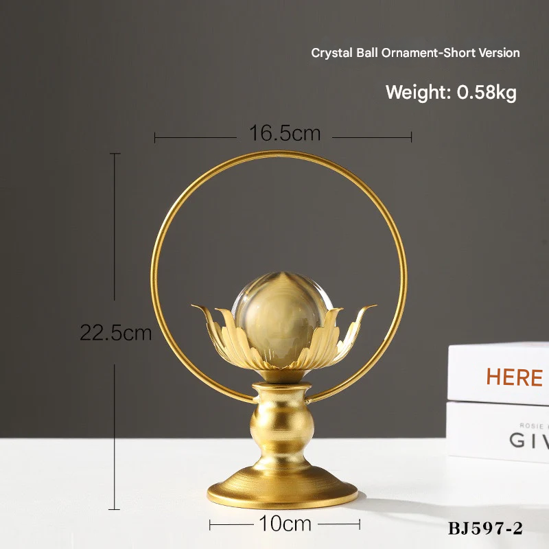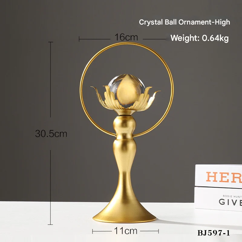 Elevate your interior with this gold crystal ball ornament, a refined blend of Eastern elegance and modern design. Crafted from high-quality metal and finished in a luxurious gold tone, it features a crystal-clear orb seated on a sculptural iron base—making it a stunning focal point for your living room, office, or desktop. Available in small and large sizes, it fits seamlessly into various spaces, whether you're styling a minimalist shelf or curating a statement console display. The luxury home decor piece is ideal for those who appreciate balance, serenity, and sophistication in their surroundings. Sourced from Worldwide Suppliers, it reflects global craftsmanship and an appreciation for timeless artistry. Whether you're redecorating or gifting, this ornament brings a touch of light luxury and charm to any room.