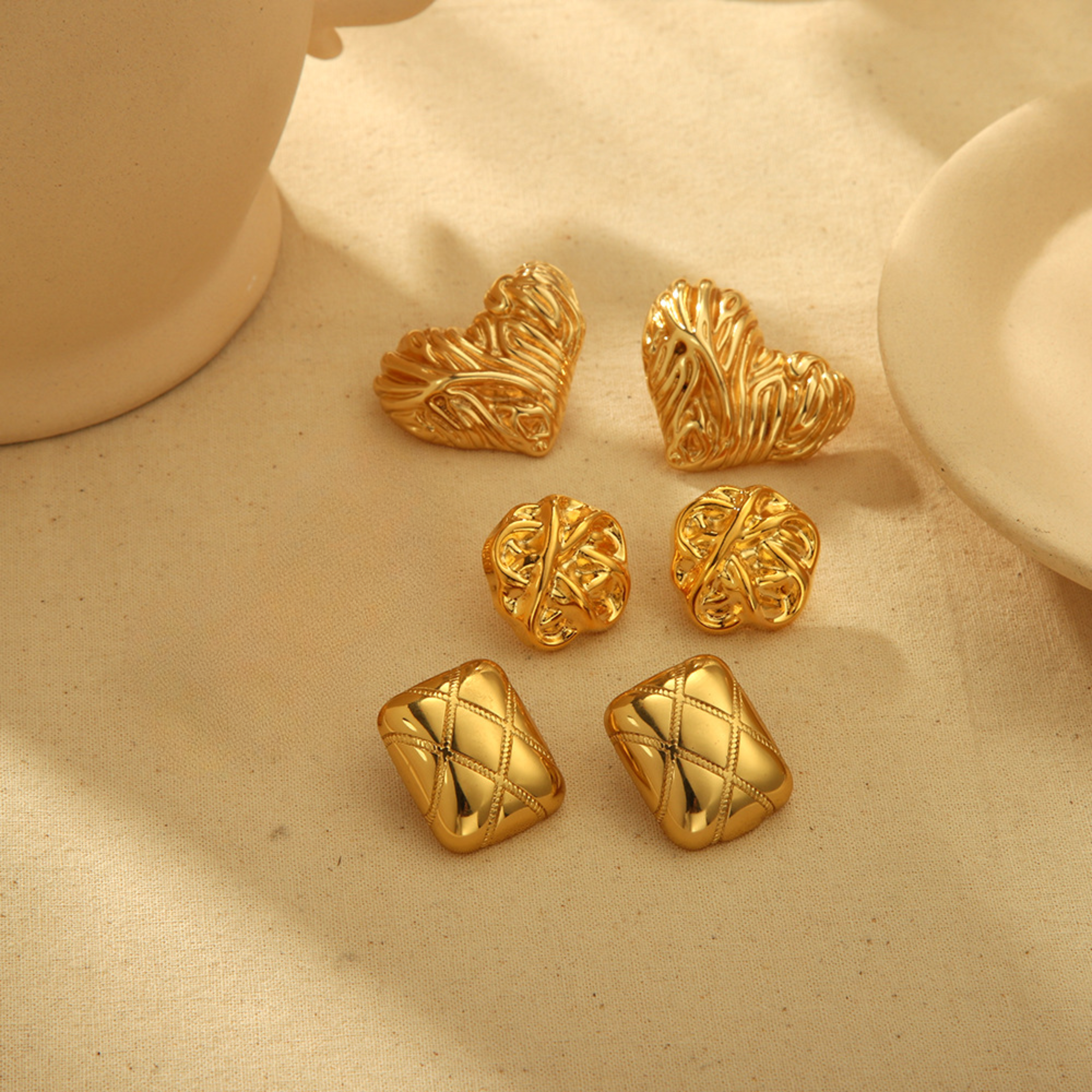 Elevate your style with these gold geometric stud earrings, featuring a unique mixed texture design that blends retro charm with modern elegance. Crafted from durable stainless steel, these lightweight earrings are perfect for everyday wear or special occasions. The small to medium size fits comfortably and suits a variety of outfits, while the secure push plug closure ensures they stay in place all day. Handpicked from abroad, these earrings add a sophisticated touch to your jewelry collection with their distinctive retro chic style. Whether you're dressing up or down, these versatile studs are designed to complement any look effortlessly. Discover the perfect blend of quality and fashion with these must-have gold stud earrings.