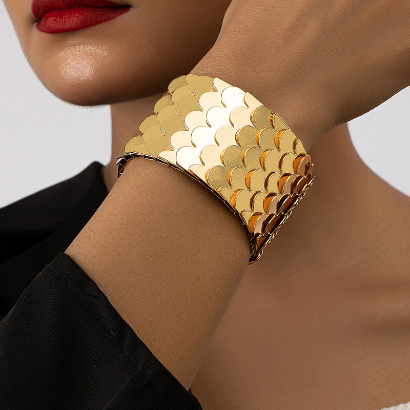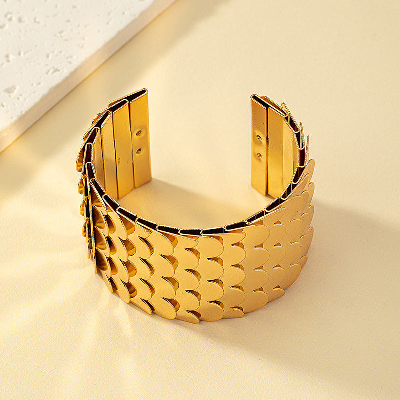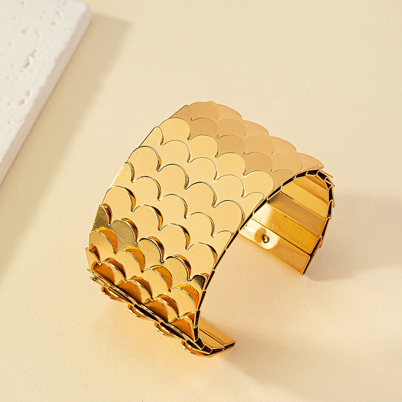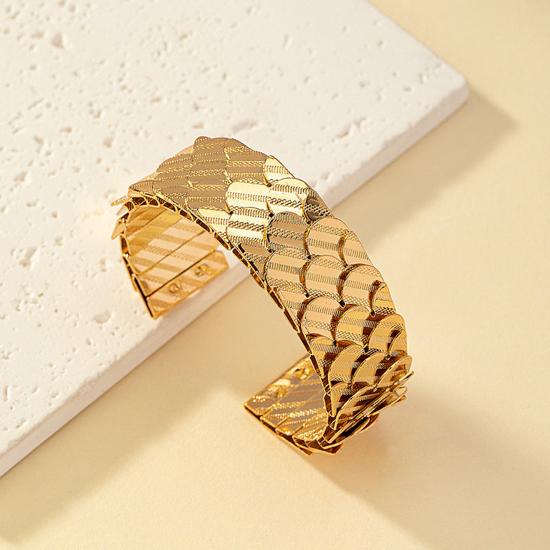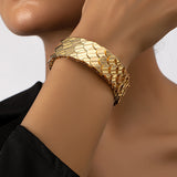 Elevate your style with this striking Gold Wide Cuff Bracelet, featuring a bold fish scale pattern that adds a touch of personality to any outfit. Crafted from durable alloy, this adjustable bracelet ensures a comfortable fit for all wrist sizes. Perfect for those who love statement jewelry, its unique 3D design captures attention effortlessly. Whether you're dressing up for a night out or adding flair to your everyday look, this wide cuff is a versatile accessory that complements any wardrobe. Handpicked from Abroad, it brings international fashion trends directly to your collection. Discover the perfect blend of elegance and edge with this must-have jewelry piece, designed to make you stand out with every wear.