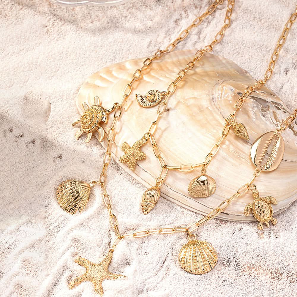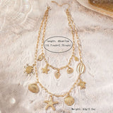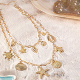 Elevate your ocean-inspired style with this Golden Starfish Conch Layered Necklace. Crafted from high-quality alloy, this stunning double-layer necklace features intricate starfish, shell, and conch pendants, evoking the charm of seaside holidays. The light luxury design in a radiant golden finish adds a touch of elegance, making it perfect for beach outings, summer vacations, or casual wear.