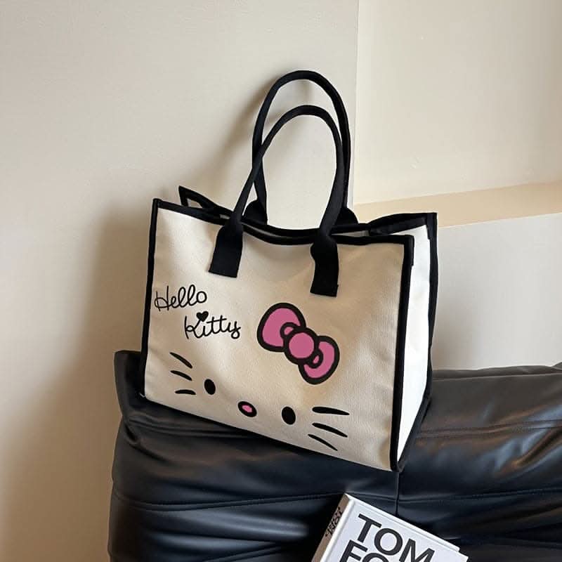 Show off your playful side with this Hello Kitty canvas tote bag. Featuring a cute cartoon design, it's perfect for school, work, travel, and shopping, offering both style and practicality in one versatile shoulder bag.