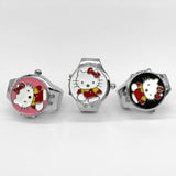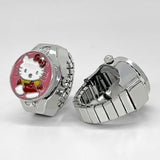 Add a touch of playful charm to your look with this Hello Kitty ring watch, designed for both style and function. Featuring a 20mm round dial with a quartz movement, this trendy finger watch ensures precise timekeeping while doubling as a fashionable accessory. The stainless steel band and durable alloy case provide a comfortable fit and long-lasting wear. The quartz glass mirror enhances the design, making it a standout piece in any jewelry collection. Available in a variety of colors including white, yellow, red, purple, green, blue, black, and pink, this adorable ring watch is perfect for Hello Kitty lovers and fashion enthusiasts alike. Whether you're dressing up or keeping it casual, this unique finger watch is the perfect statement piece or gift for any occasion!