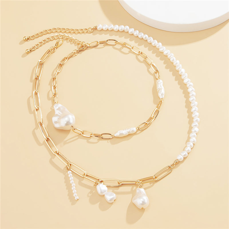 Make a statement with this Layered Pearl Chain Necklace, a chic fusion of elegance and trend. The irregular Baroque-style pearls paired with gold-tone chains bring a luxurious yet modern edge to your jewelry collection. Designed with electroplated detailing for lasting brilliance, this necklace complements both everyday looks and special occasions. Its tiered layers and unique geometric accents highlight individuality and style confidence. Lightweight yet striking, it’s a must-have piece for women who love refined fashion with a touch of boldness. Sourced from Worldwide Suppliers, this necklace captures the essence of contemporary design and global sophistication.