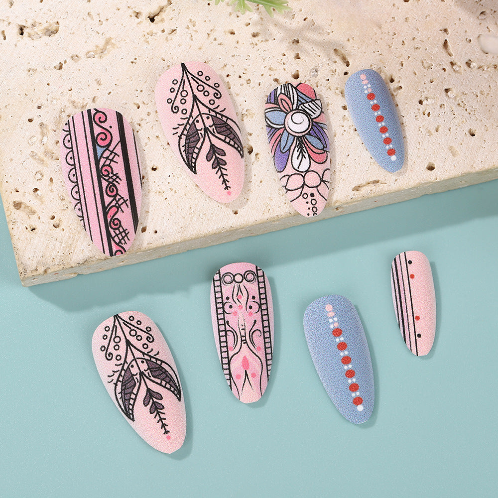 Elevate your nail game with this stunning Boho press-on nails set, designed for those who love bold, artistic expression. Featuring a mix of matte rose, navy blue, and peach shades, each long almond nail is adorned with unique floral, tribal, and geometric motifs. From mandalas to leaf-inspired doodles, these intricate designs create a perfect balance of elegance and creativity. Made from high-quality acrylic, they’re lightweight, durable, and easy to apply for a salon-worthy manicure at home. Whether you’re heading to a festival, a getaway, or simply want to make a stylish statement, these nails are your go-to accessory. Sourced from Worldwide Suppliers, this set combines cultural artistry with modern wearability for a truly unique look.