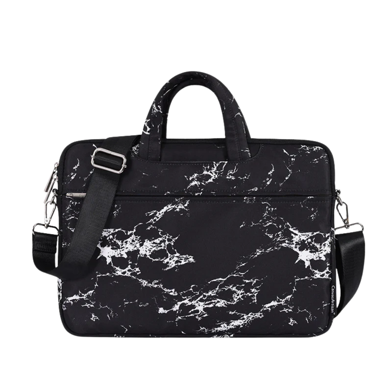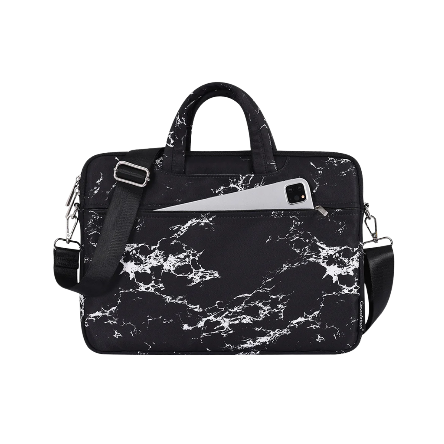 Featuring a soft polyester lining and secure main zipper compartment, it fits 13", 14", and 15" laptops comfortably. The additional front pocket is perfect for accessories like your charger, phone, or notepad. Whether you’re heading to work, school, or the café, the abstract marble design adds a sophisticated edge to your everyday carry.