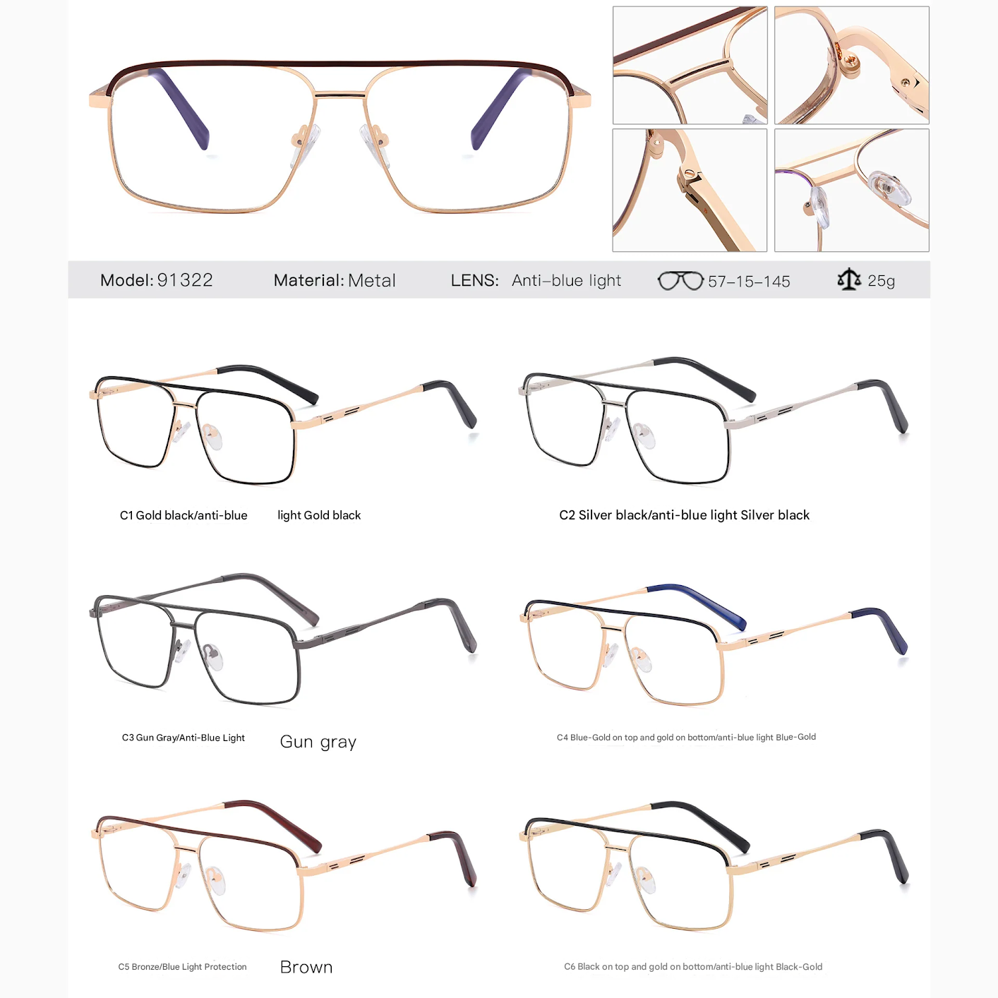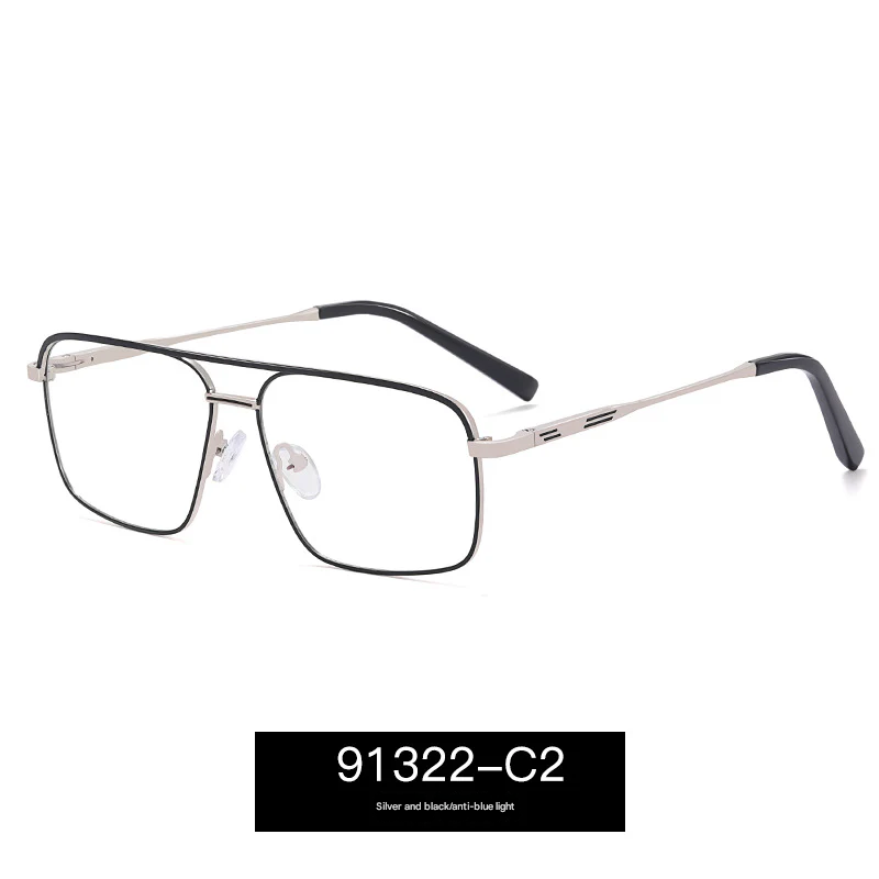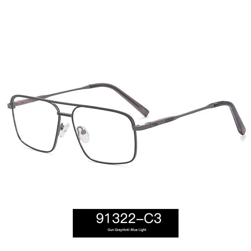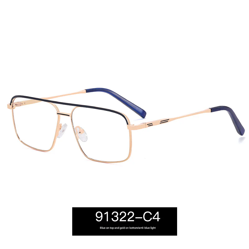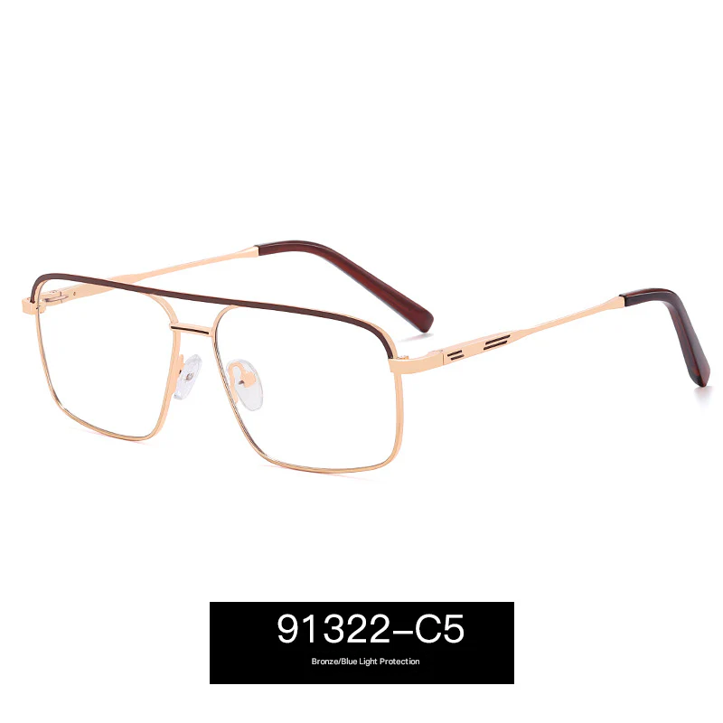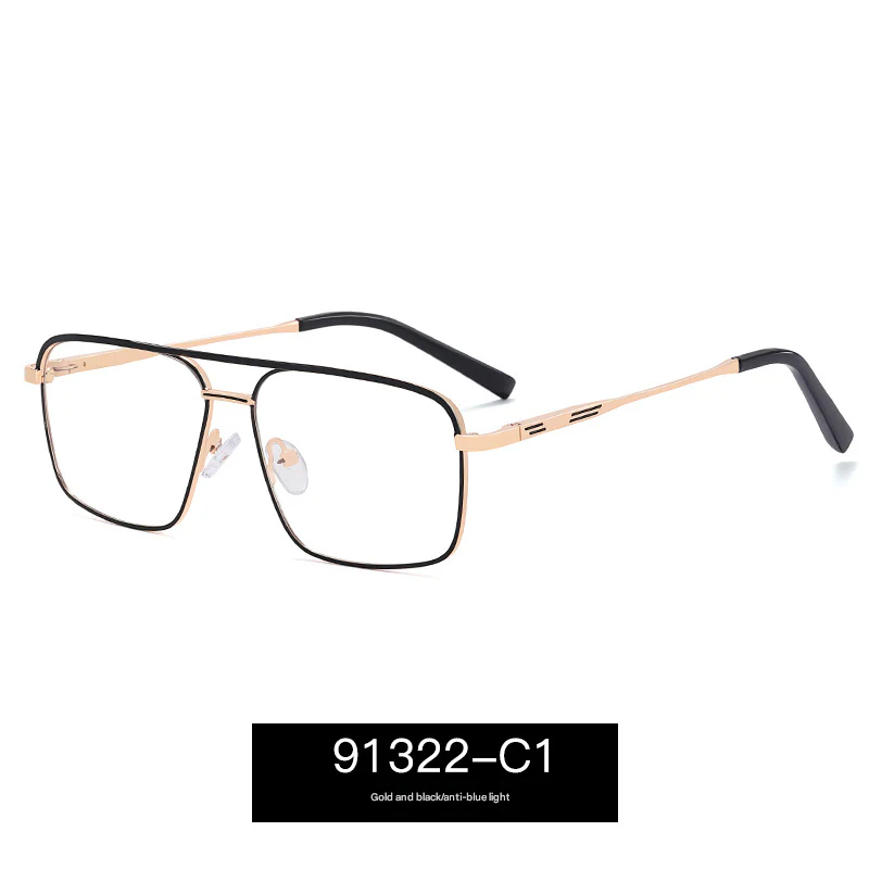 Designed with a lightweight yet durable thin metal full frame, the bold box-style silhouette features a distinctive double beam bridge—perfect for men who appreciate detail. The PC lenses come equipped with anti-blue light and UV400 protection, helping to reduce eye strain from screens while blocking harmful UV rays.