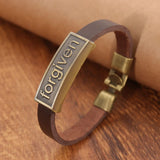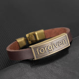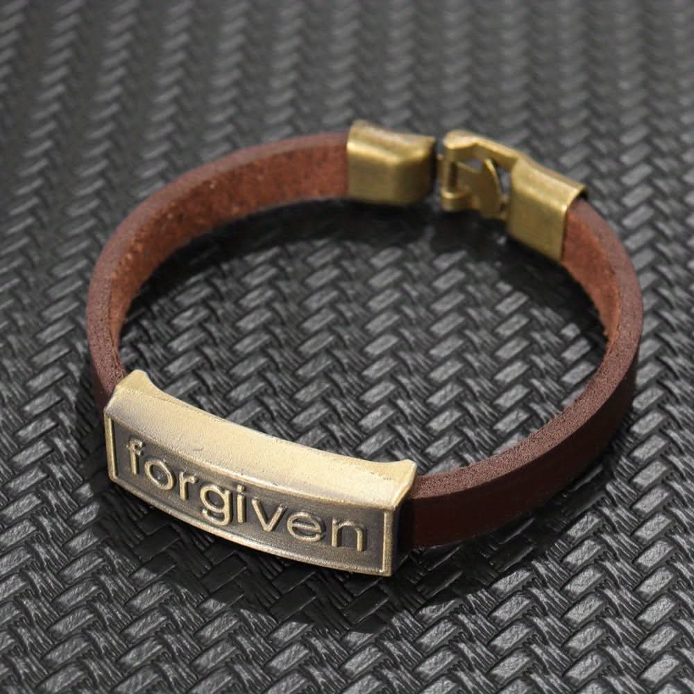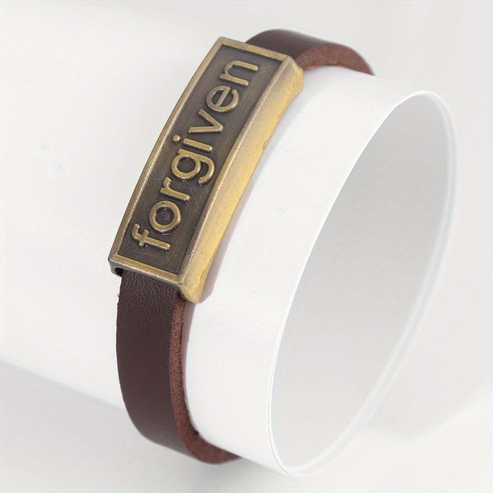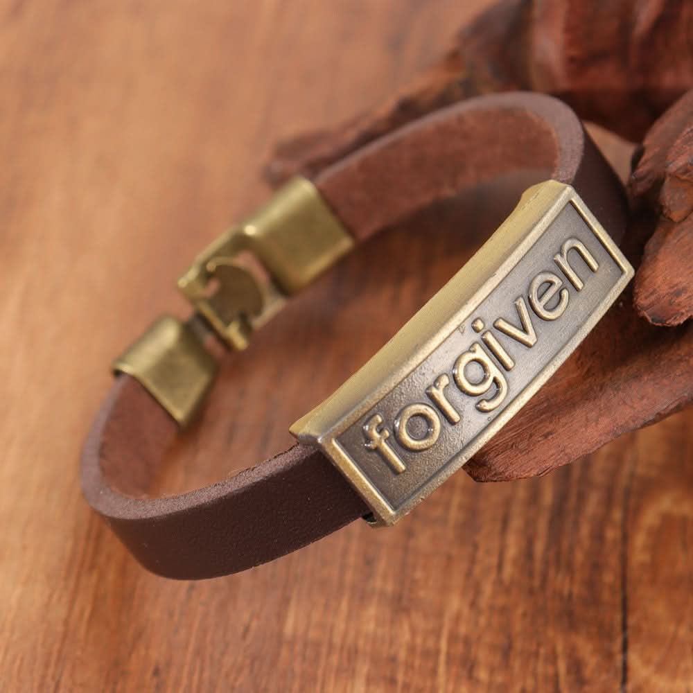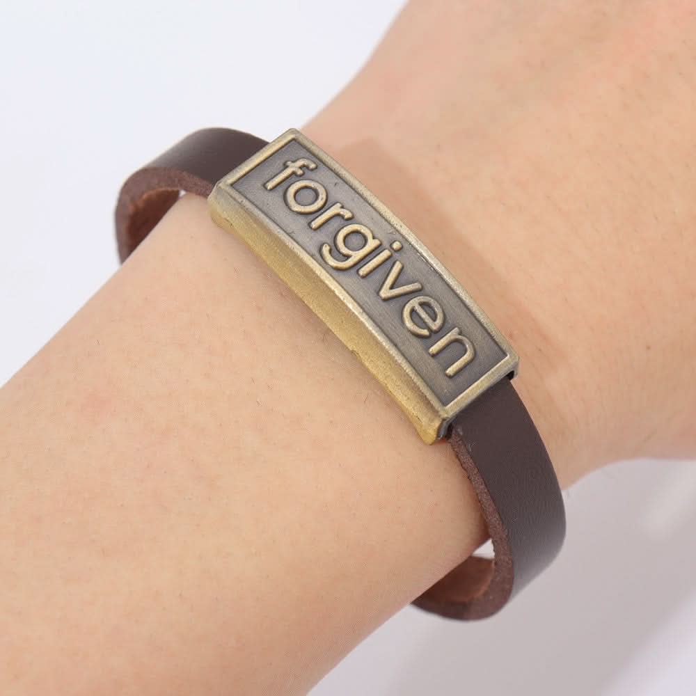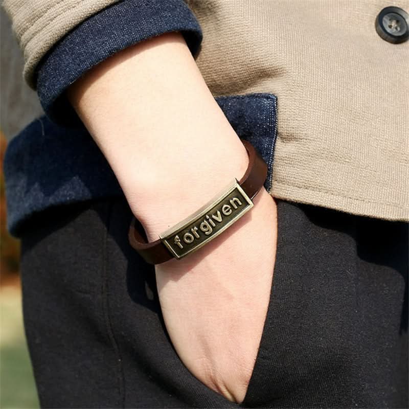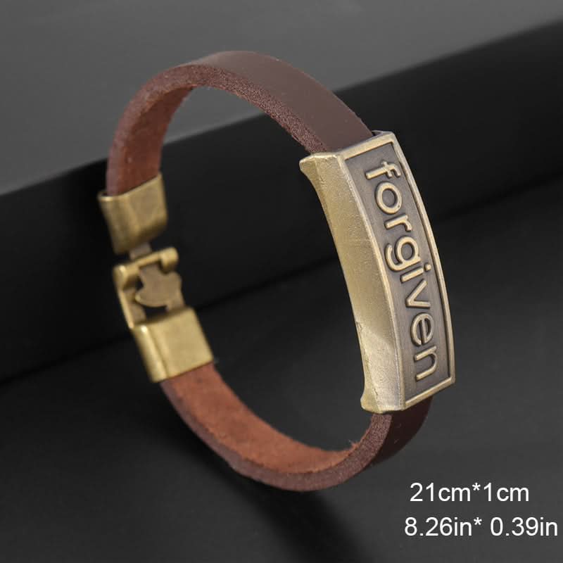 This “Forgiven” leather bracelet combines rugged style with a meaningful message, perfect for the modern man. Crafted from durable PU leather, the bracelet features a bold metallic link engraved with "Forgiven," offering a unique and stylish statement piece. Its adjustable clasp ensures a comfortable fit for everyday wear, making it versatile enough to pair with any outfit, whether casual or edgy. Ideal as a thoughtful gift or a personal keepsake, this bracelet adds a touch of urban charm to any look. Embrace a timeless design with a meaningful twist—this bracelet is more than just an accessory; it’s a message you carry with you.