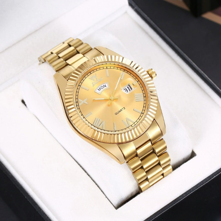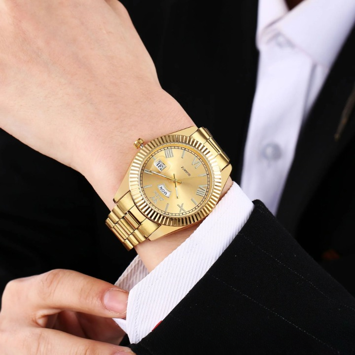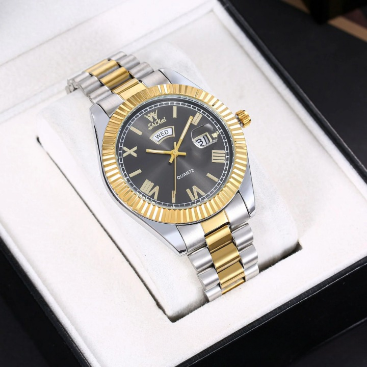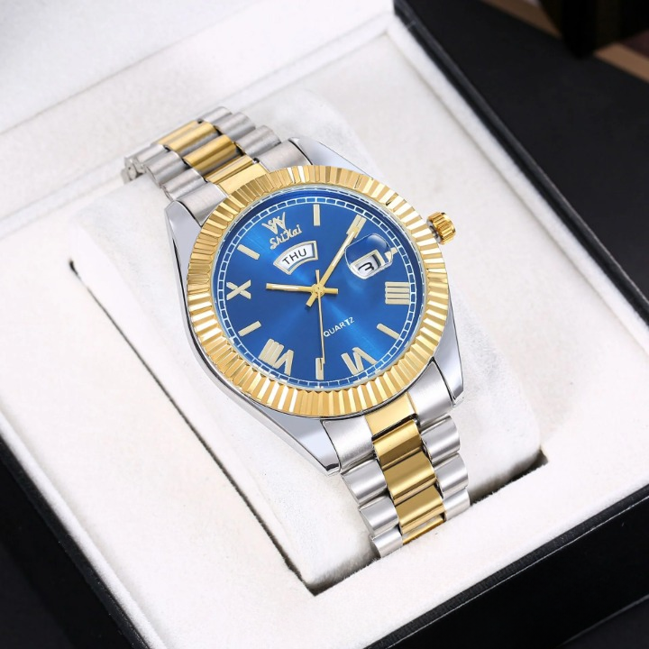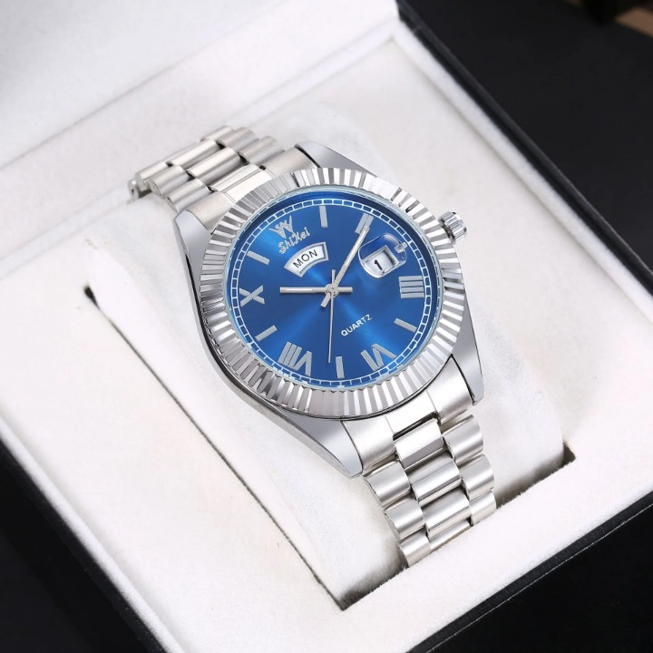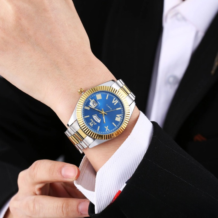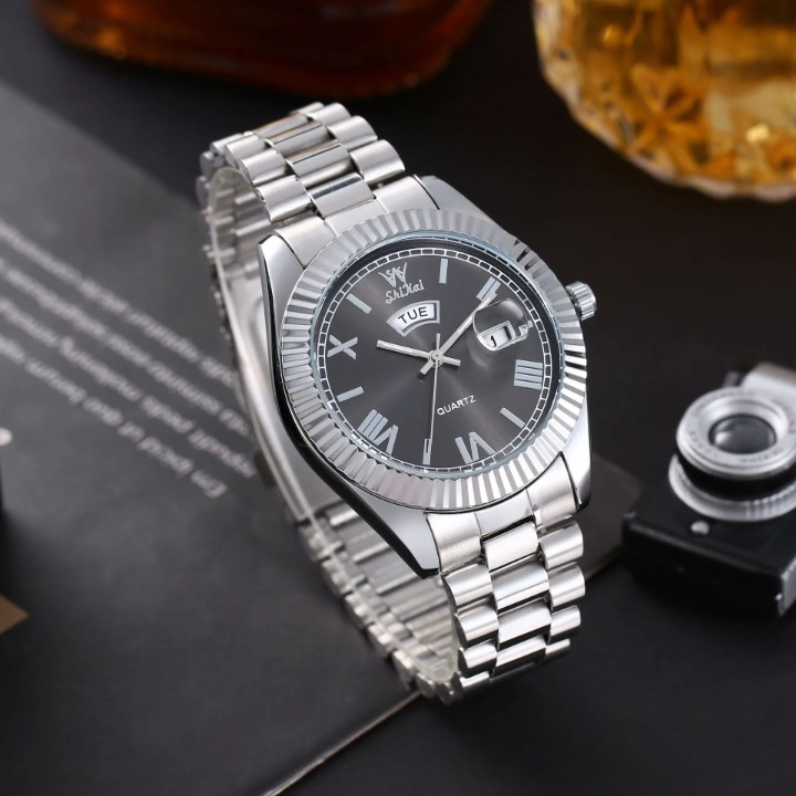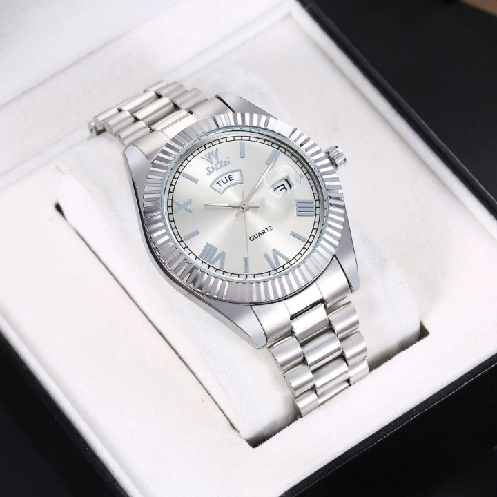 Elevate your style with this sleek men’s quartz watch, designed for both business and casual wear. Featuring a 40.5mm round dial with a dual calendar display for date and day tracking, this timepiece ensures you stay punctual in style. The luminous hands and markers provide easy readability in low light, while the waterproof construction adds durability for everyday use. Crafted with a stainless steel strap and a scratch-resistant mineral glass mirror, this watch blends elegance with reliability. The screw-down crown enhances water resistance, making it a great companion for daily wear. Whether you're in the office or out for an evening event, this versatile and sophisticated watch is the perfect finishing touch to any outfit.