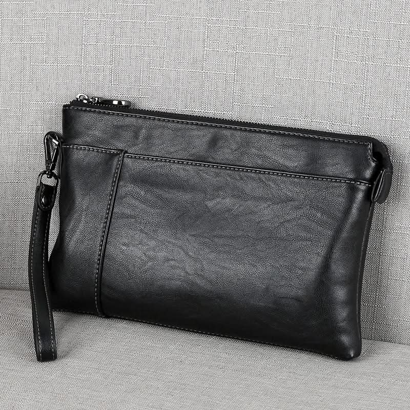 Elevate your everyday style with this sleek Men's PU Leather Clutch Bag, designed for both practicality and sophistication. Featuring a spacious interior, this large capacity bag easily holds your essentials like your mobile phone, wallet, and keys. Crafted from durable PU leather, it offers a premium leather texture with a smooth polyester lining for added durability. The bag’s waterproof and ultra-light design ensures convenience and protection during daily commutes, travel, or casual outings. Enhanced with stylish sewing thread details, this versatile clutch pairs effortlessly with both casual and formal outfits. Its urban simplicity design offers a clean, modern aesthetic, while the load-reducing feature adds extra comfort. Available in black and offered in both large (29x19cm) and small (26x17cm) sizes, this clutch is the perfect combination of style and functionality.