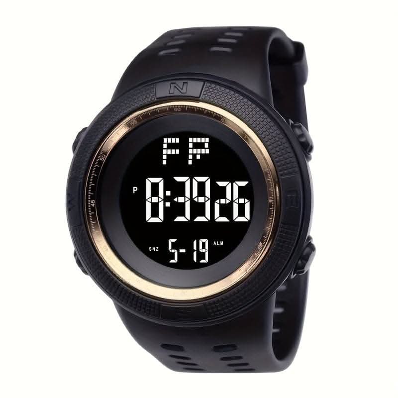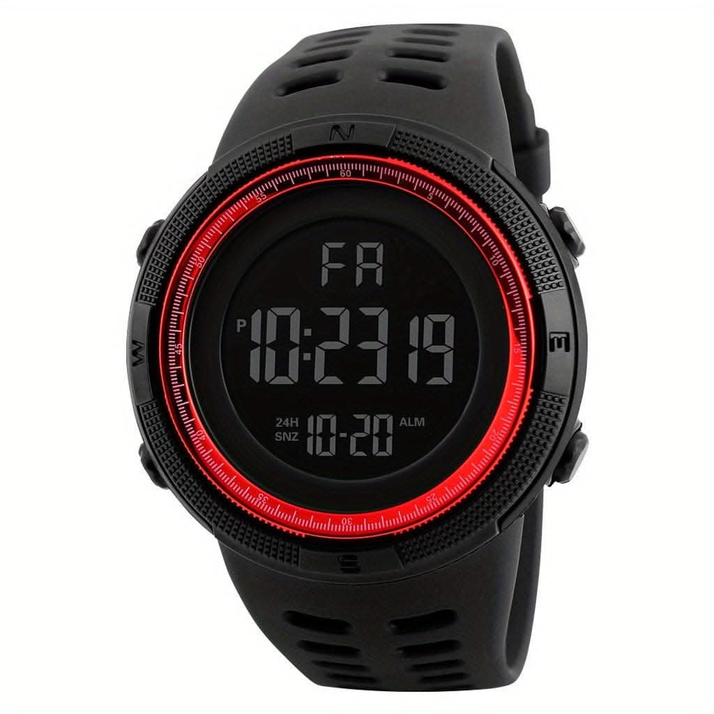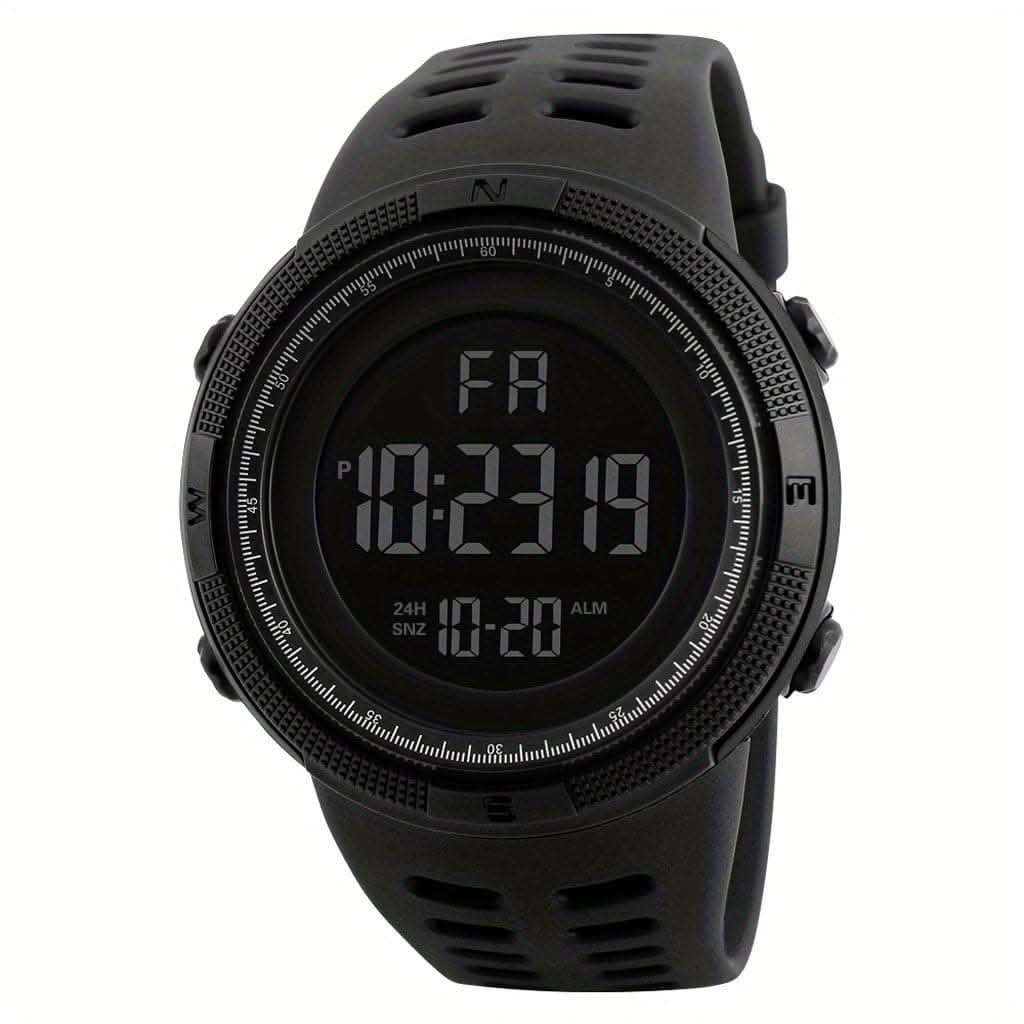 This men's sports electronic watch features a large dial with luminous hands for easy readability, an alarm function, and a rugged round design. It combines practicality with a sporty aesthetic, ideal for active lifestyles.