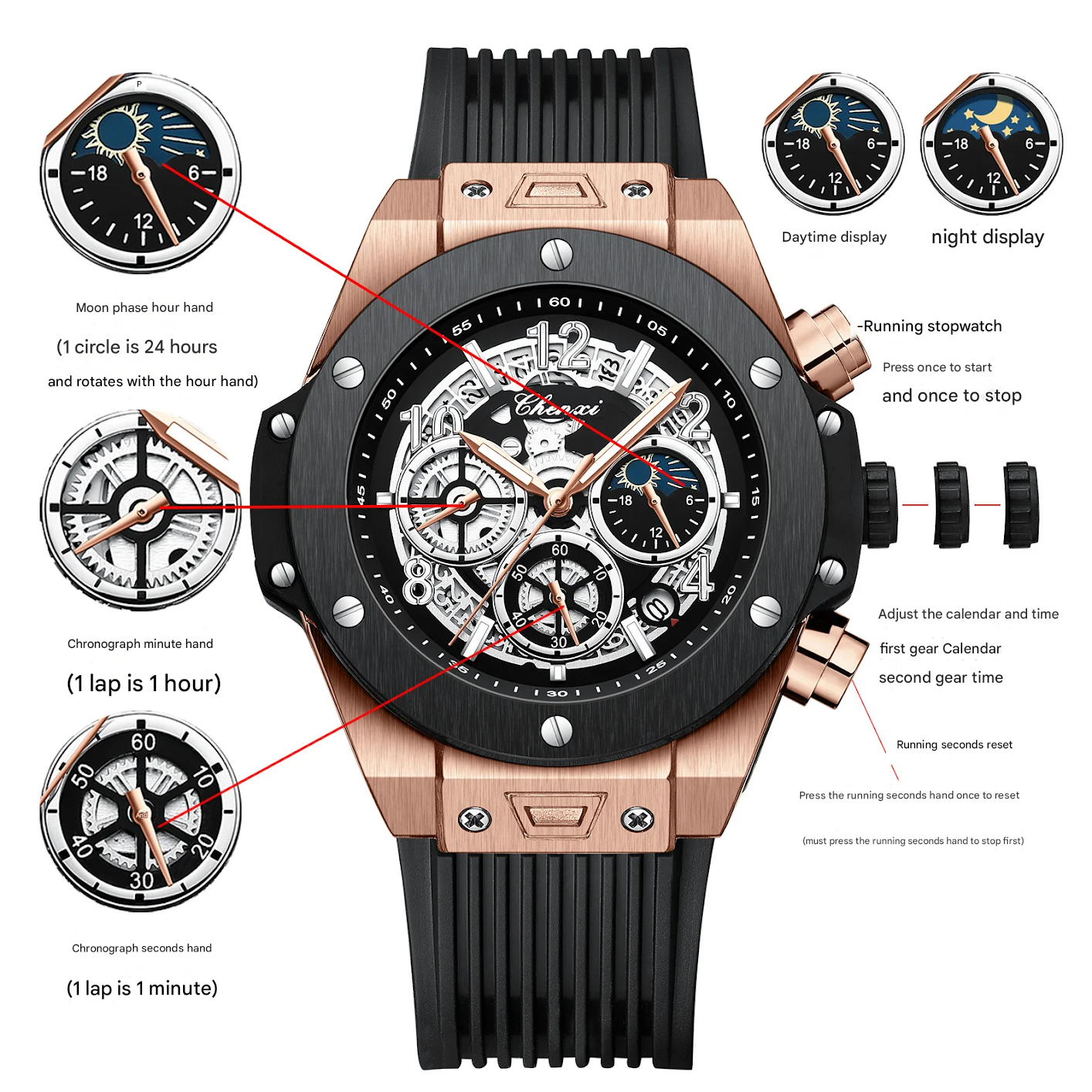 Special Features: Luminous, Moon phase, Countdown, Small three-hand, Moon phase display