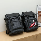 Make a bold statement with this men's plaid Oxford backpack featuring a striking shark face design. Crafted from durable Oxford cloth, this backpack combines European and American retro style with modern functionality. Its large capacity offers ample room for books, a laptop, or travel essentials, making it perfect for school, work, or weekend trips. The breathable design ensures comfort during extended wear, while the sturdy polyester lining enhances durability. Available in sleek black with eye-catching shark bite and monogram patterns, this backpack stands out from the crowd. Detailed sewing thread accents add a refined touch, blending fashion with practicality. Whether you’re commuting or exploring, this versatile backpack is designed to keep up with your lifestyle.