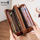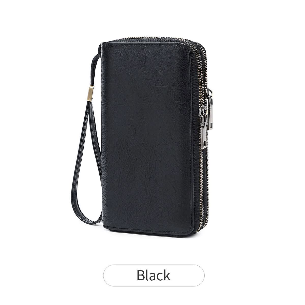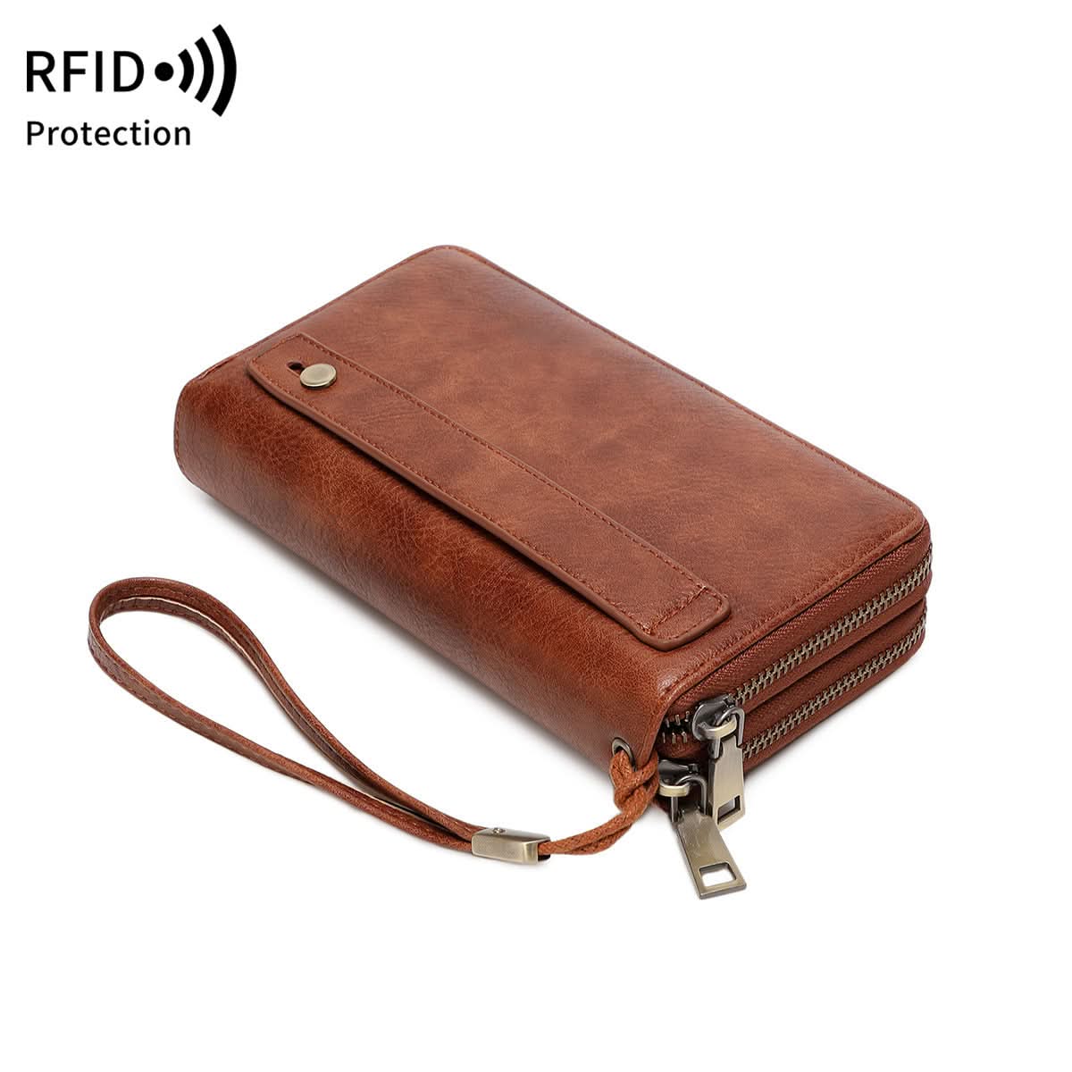 Stay organized and secure with this RFID-blocking PU leather wallet, designed for both business and casual use. Featuring a stylish European and American retro design, this long wallet offers a spacious double-zipper compartment to store cash, cards, and essentials with ease. Crafted from high-quality PU leather with a soft polyester lining, it is waterproof and wear-resistant, ensuring long-lasting durability. The RFID-blocking technology protects your cards from unauthorized scanning, adding an extra layer of security. The detailed sewing thread accents and solid color finish elevate its sophisticated look. Available in brown, black, wine red, peacock blue, grey, and pink, this versatile wallet suits any outfit or occasion. Ideal for daily use or travel, this wallet combines practicality with refined style.