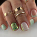 Refresh your manicure with these Modern Green French Press-On Nails. Featuring a chic blend of mint green, nude, white, and glittery green, each nail showcases elegant gradient patterns, glitter lines, and accent designs for a polished, sophisticated look. Crafted from high-quality gel and nail polish, these medium-sized square and rounded nails provide a natural yet stylish finish that’s perfect for everyday wear or special occasions. Designed for easy application and long-lasting wear, they offer salon-quality results without the hassle. Handpicked from Abroad, this collection combines international nail trends with practical convenience, making it ideal for fashion-forward individuals who want a modern, elegant manicure at home. With a perfect balance of subtlety and sparkle, these press-on nails are a must-have for achieving effortless style and confidence in every gesture.
