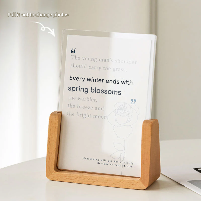 Showcase your favorite memories with this modern solid wood U-shaped photo frame, a stylish addition to any workspace or home. Designed with a sleek acrylic front and a minimalist wood base, it offers a clean, floating look that highlights your photos beautifully. Choose from premium beech or black walnut finishes in multiple sizes, perfect for desks, shelves, or entryways. Whether placed in the living room, bedroom, or study, this frame blends seamlessly into modern interiors. Crafted with care and attention to detail, each frame is handmade for lasting quality and charm. It’s easy to use—just slide in your photo for a quick, elegant display.