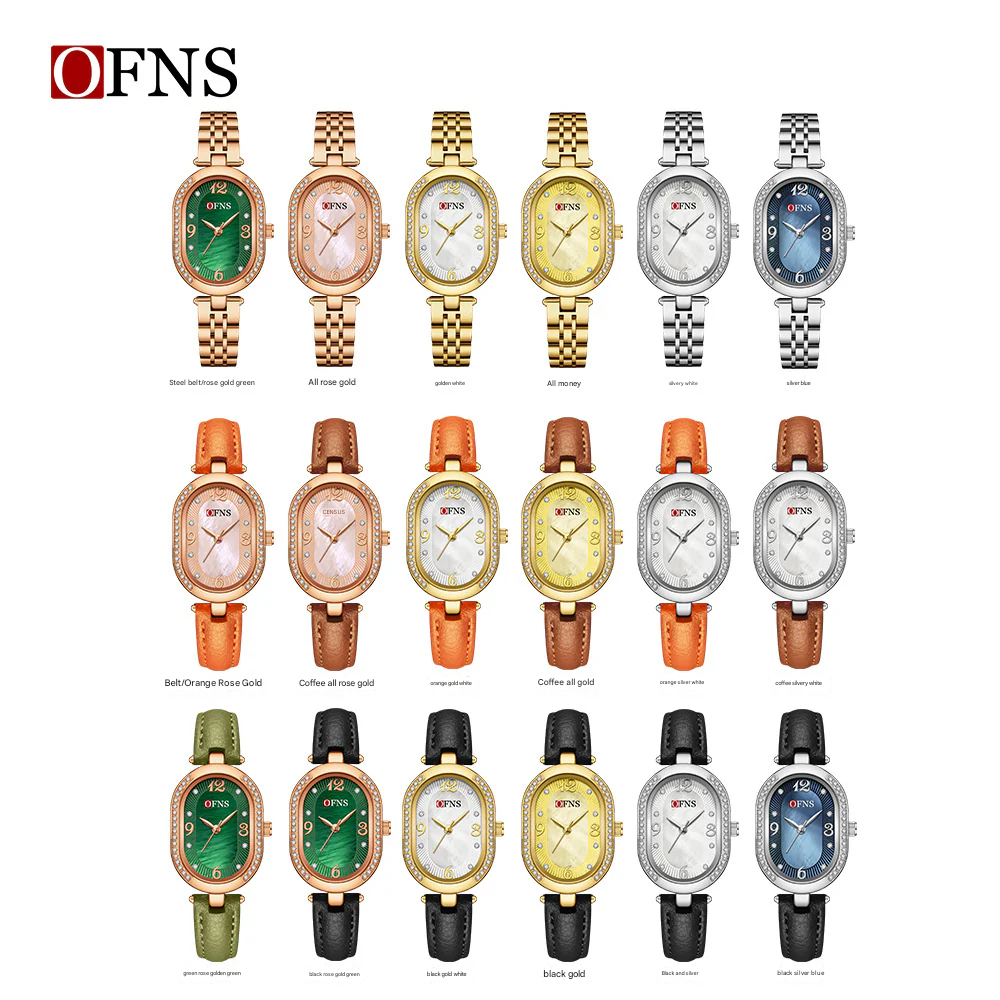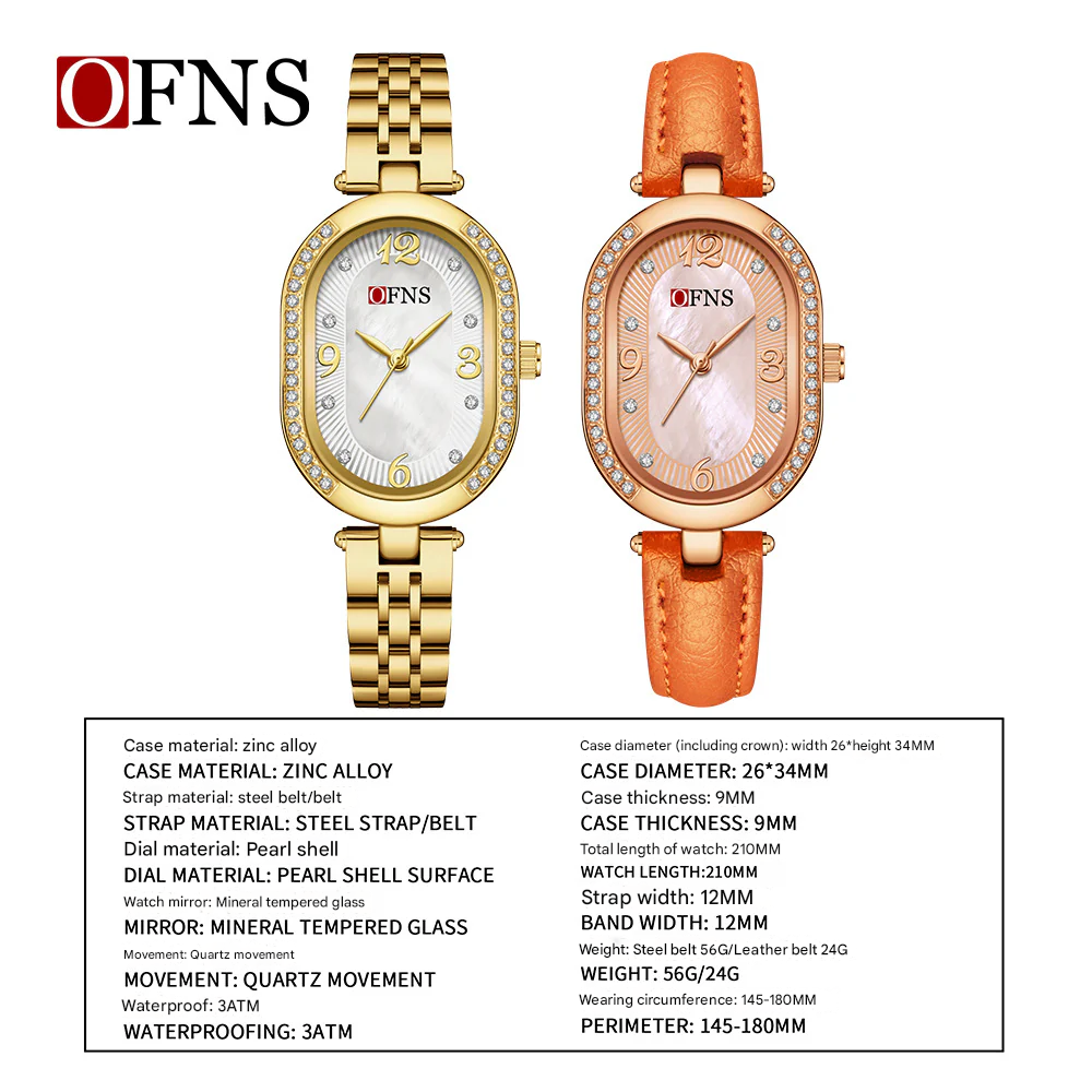 Add a touch of elegance to any outfit with the OFNS Diamond Oval Quartz Watch, designed for women who appreciate timeless fashion. Its exquisite oval dial, accented with sparkling diamond details, creates a sophisticated and luxurious look. The durable zinc alloy case paired with mineral tempered glass ensures long-lasting protection, while the comfortable leather strap with pin buckle offers a secure fit for all-day wear. With 30M water resistance, this watch is perfect for daily activities, office wear, or casual outings without worrying about splashes. Measuring 26mm by 34mm and only 9mm thick, it fits elegantly on any wrist. Handpicked from Abroad, this watch combines international quality, stylish design, and precise quartz movement, making it a must-have accessory for women who seek both beauty and functionality.