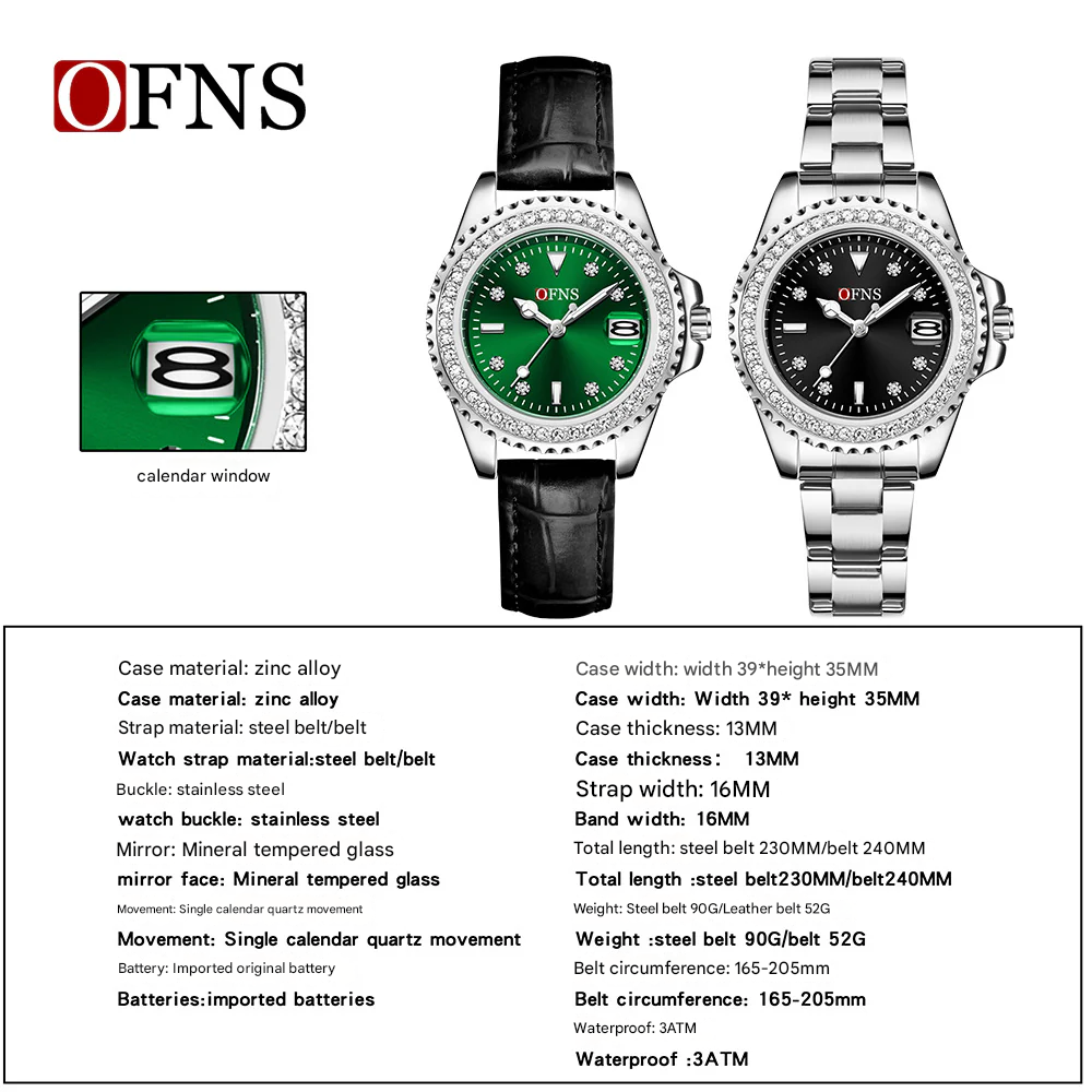 The OFNS Women’s Luxury Quartz Watch is designed for those who appreciate timeless elegance with a modern touch. Featuring a round diamond-inlaid dial, this watch combines sophistication with everyday practicality. Powered by a precise single calendar quartz movement, it not only keeps accurate time but also includes a handy date display. The 39×35mm case with a 13mm profile is crafted from durable zinc alloy, paired with a comfortable leather strap and secure pin buckle closure. Its luminous hands make it easy to read in any light, while the mineral tempered glass mirror adds scratch resistance and clarity. With 30M water resistance, it’s suitable for daily wear and light splashes. Sourced from Worldwide Suppliers, this watch is the perfect blend of luxury, reliability, and versatility for women who want a fashionable yet functional accessory.
