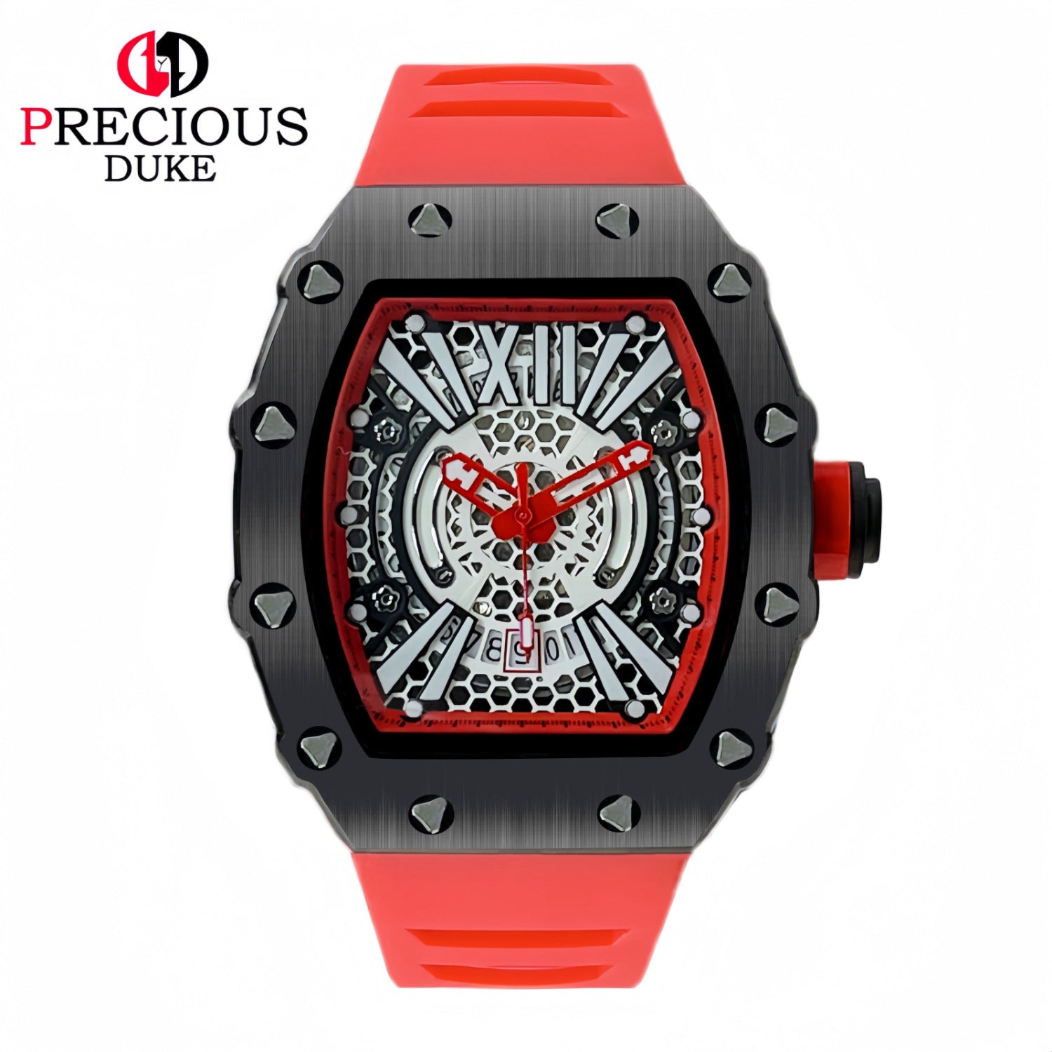 - Distinctive 43×51mm Richard barrel-shaped dial