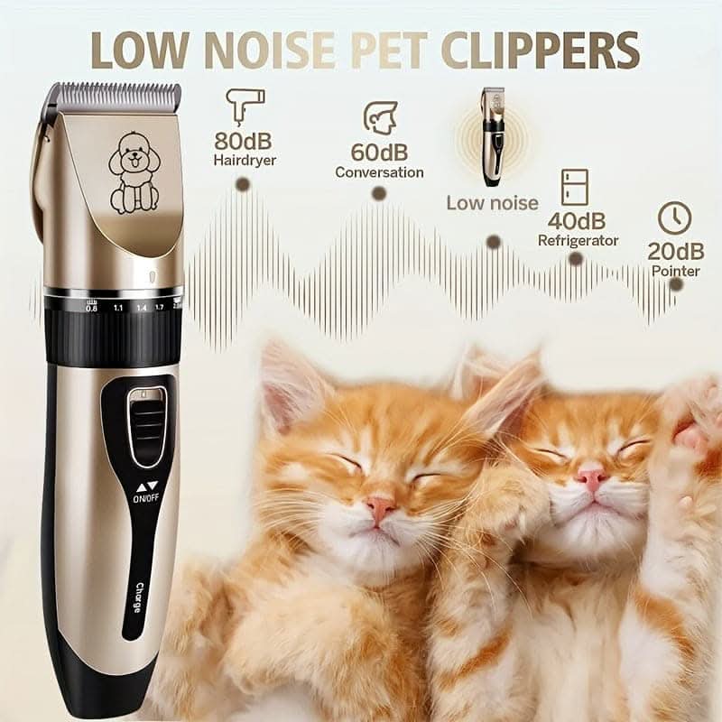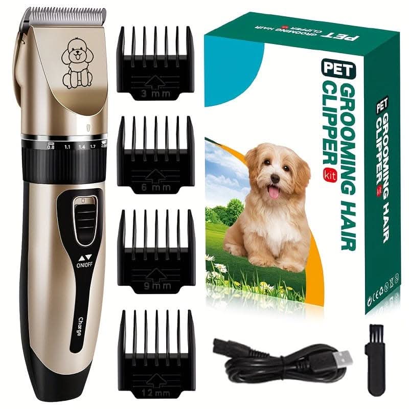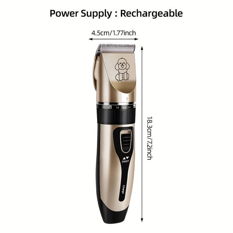 Premium Pet Hair Trimmer Kit. This high-quality set includes electric precision clippers designed with gentle cutting technology, making it perfect for both dogs (including teddy breeds) and cats. The ergonomic design ensures comfortable handling, while the quiet, efficient operation minimizes stress for your pet. Achieve a professional finish at home with ease and confidence.