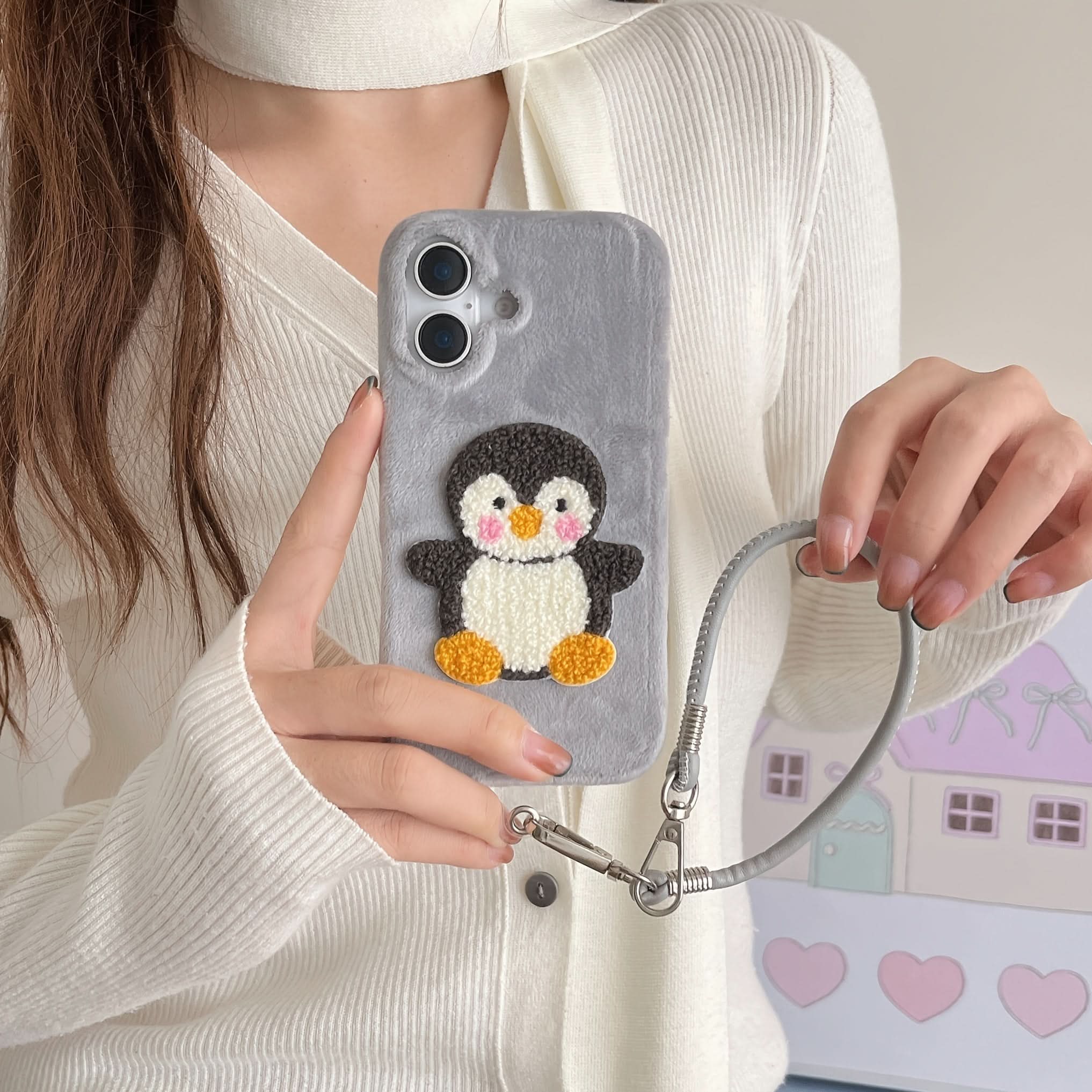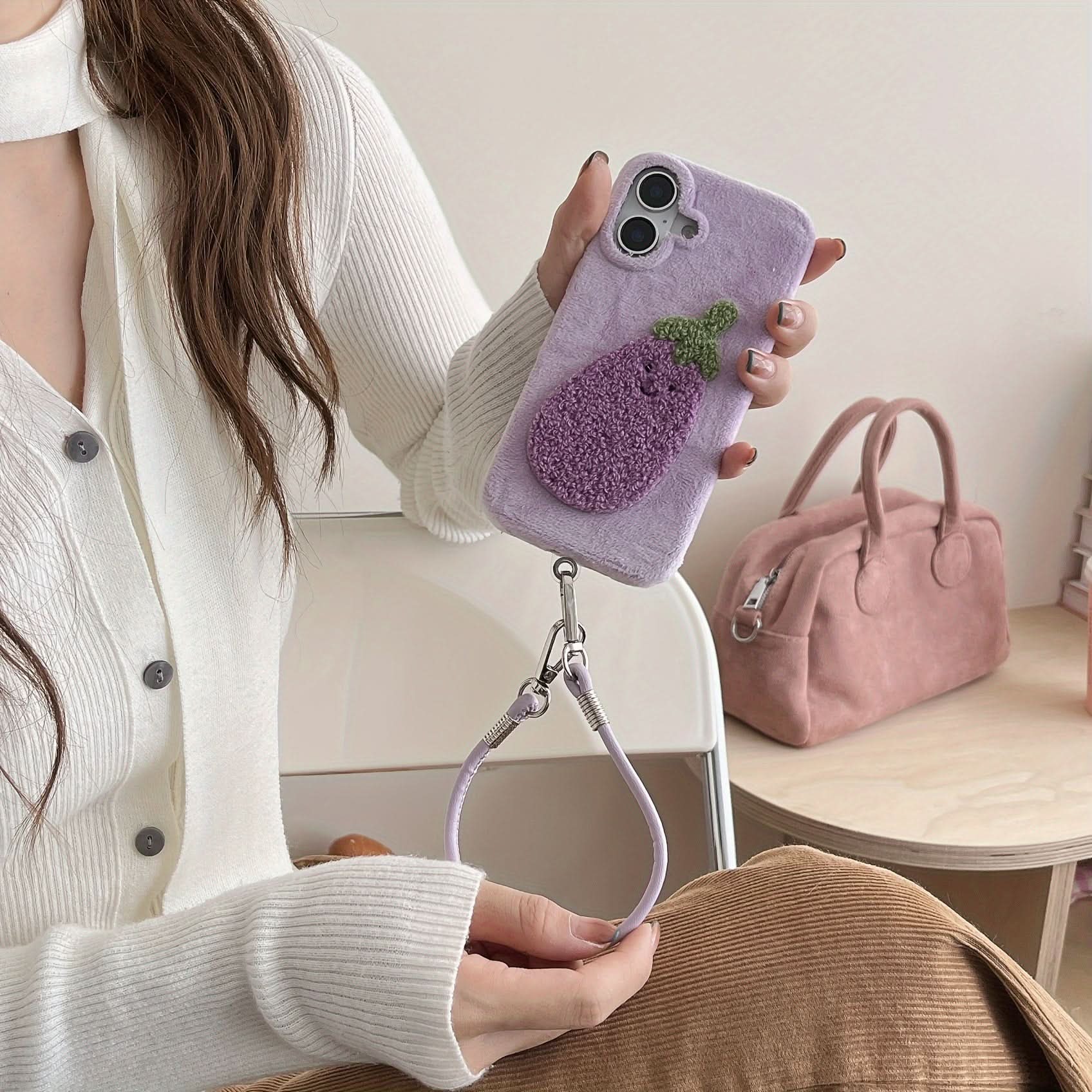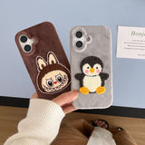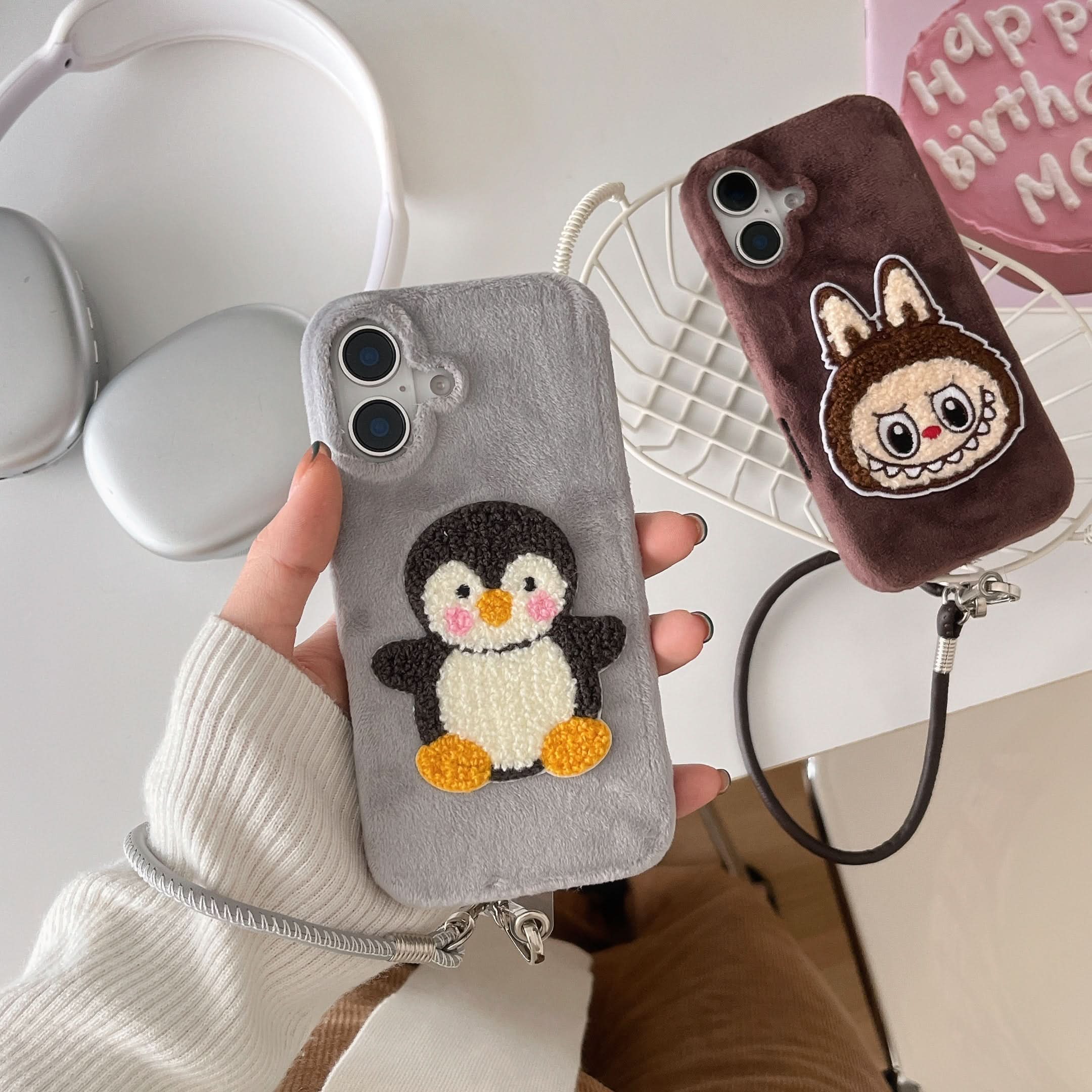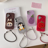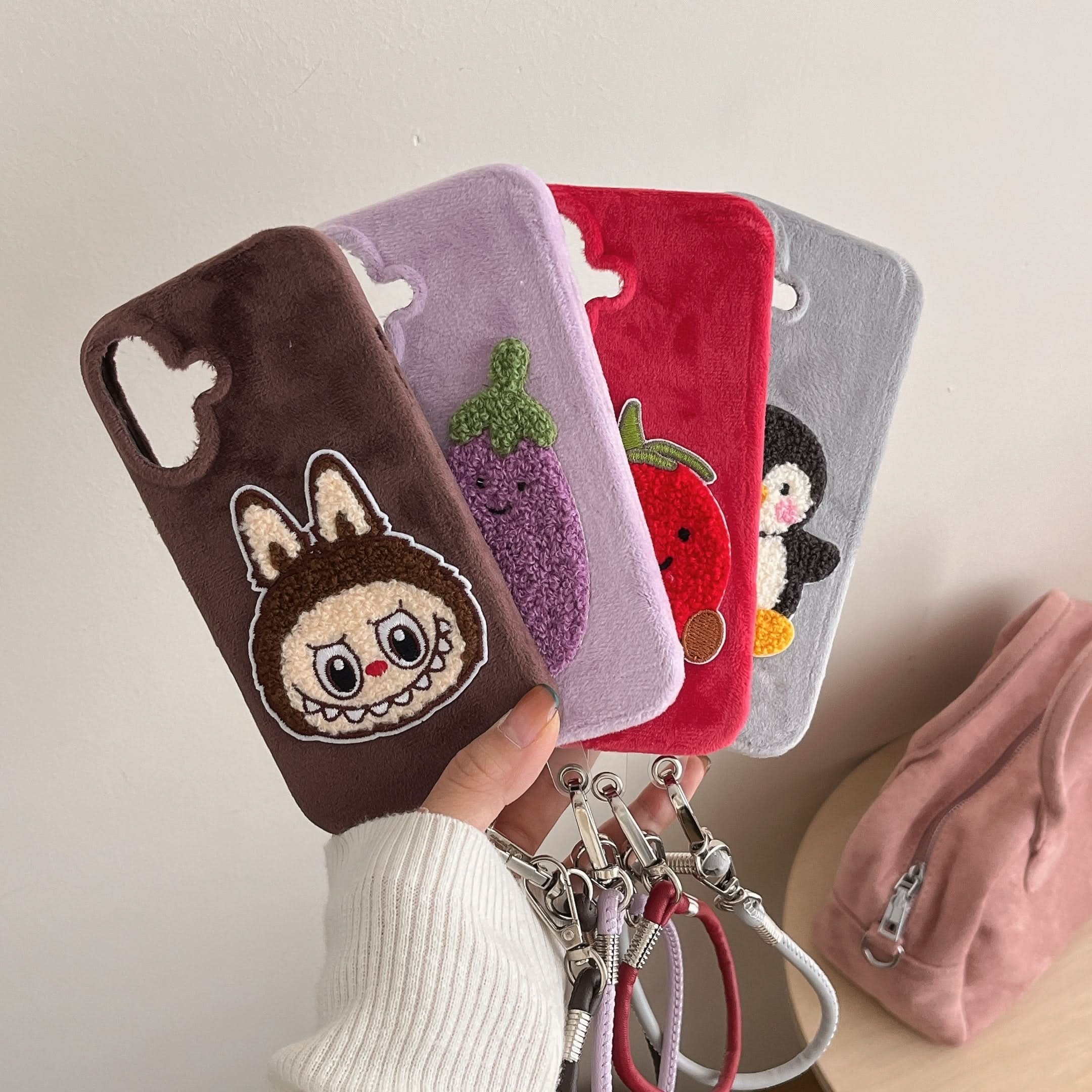 Protect your iPhone in style with this adorable velvet plush embroidered case! Designed to fit iPhone 16, 15, 14, 13, and 12 Pro/Pro Max models, this case features charming Labu-themed embroidery with playful penguin, eggplant, and tomato motifs. The soft plush cloth exterior offers a unique, cozy texture, while the durable drop-resistant design shields your phone from everyday bumps and scratches. An included lanyard adds convenience, allowing you to carry your phone hands-free and securely. Precision cutouts ensure easy access to buttons, ports, and the camera without compromising functionality. This case is perfect for anyone looking to combine practicality with a fun and eye-catching design. Whether for yourself or as a gift, this stylish and protective case makes your iPhone truly stand out!