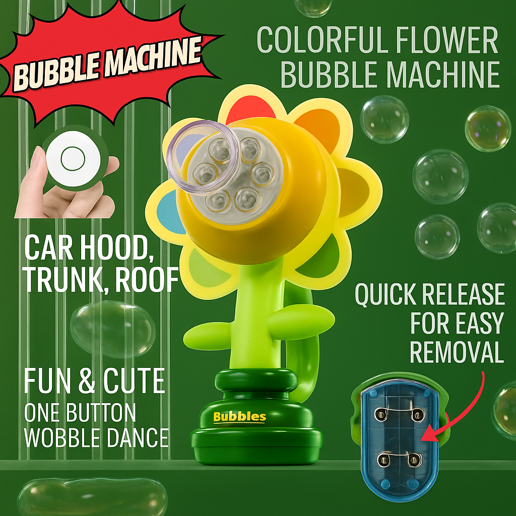 Delight your little one with the Rechargeable Seven-Color Flower Bubble Machine, a charming and colorful toy that brings joy, movement, and magic to any playtime. Shaped like a cheerful sunflower, this electric bubble blower features three-speed settings, vibrant LED lights, and a fun swinging motion that captivates young minds. Whether installed on a car hood, trunk, or roof, this bubble machine is a guaranteed crowd-pleaser—perfect for outdoor fun or festive events.