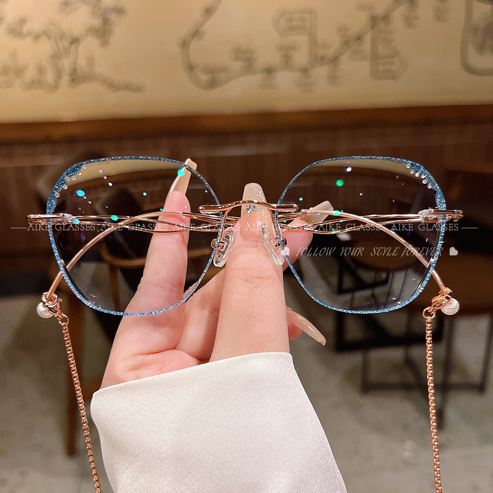Step up your eyewear game with these stylish retro polygonal glasses, designed with a frameless structure and double chain accents for a bold, literary-inspired look. The lightweight metal frame in a chic champagne gold finish adds elegance, while the resin lenses offer essential eye protection. Featuring anti-blue light, anti-radiation, UV-blocking, and discoloration-resistant technology, these glasses are perfect for screen time or sunny strolls alike.