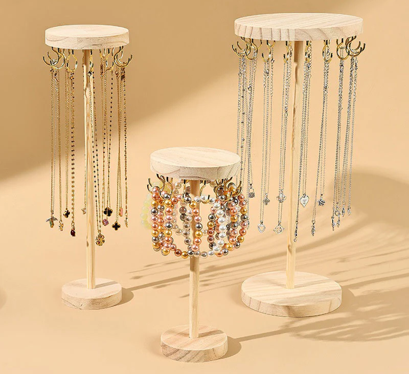 Keep your jewelry organized and beautifully displayed with this Round Wooden Jewelry Display Rack, designed specifically for bracelets and necklaces. Crafted from solid wood, this stylish organizer adds a natural touch to your décor while providing a functional solution for your accessories. The round design offers ample space for hanging multiple pieces, making it easy to find your favorite items without tangling or clutter. Its sturdy construction ensures durability, while the elegant finish complements any room style, from modern to rustic. Ideal for personal use or as a thoughtful gift for a jewelry lover, this display rack transforms your collection into an eye-catching centerpiece. Say goodbye to tangled necklaces and misplaced bracelets—this organizer is the perfect blend of style and practicality!
