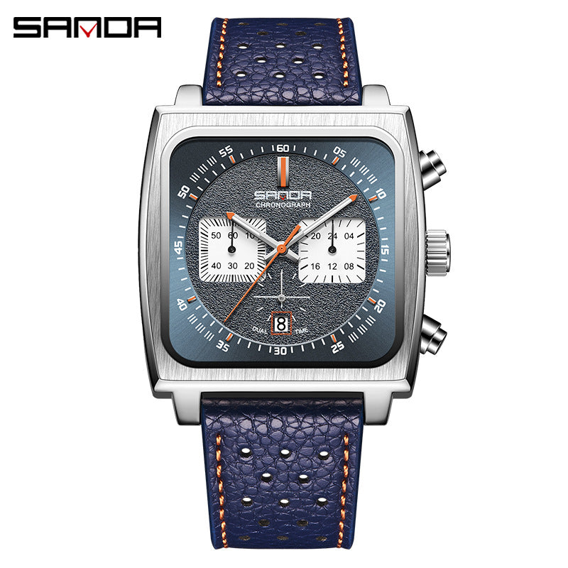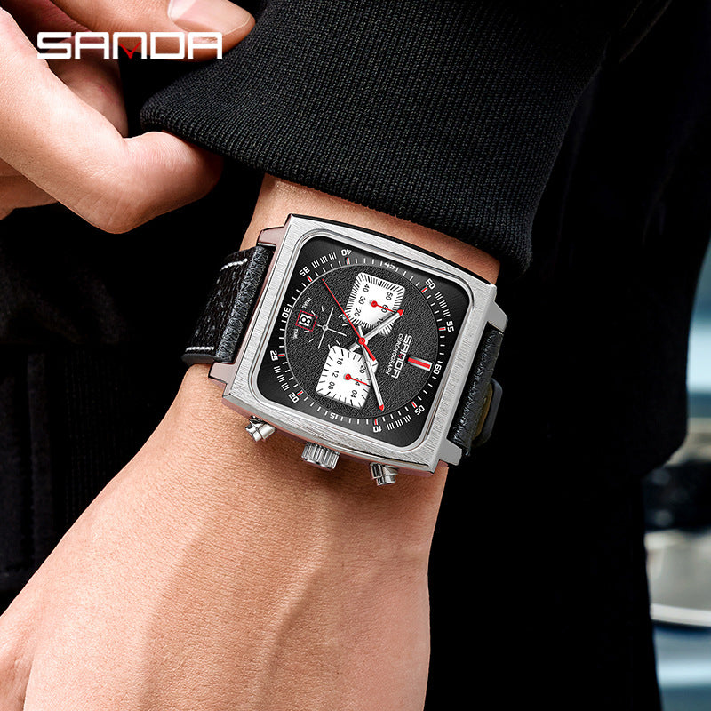Add a touch of sophistication to your look with the Sanda Men’s Square Quartz Watch, a stylish blend of elegance and performance. Featuring a three-eye six-hand dial with a functional calendar display, this watch delivers both precision and personality. The luminous hands provide clear visibility at night, while the 30M water resistance ensures reliability for everyday wear. Its zinc alloy case and mineral glass mirror enhance durability, and the leather strap offers all-day comfort with a refined business style. Whether for work or casual occasions, this square-faced design stands out for its modern yet timeless appeal. Handpicked from Abroad, it’s crafted for men who value detail, quality, and understated luxury.