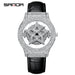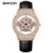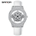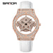 Add a touch of charm to your everyday look with the SANDA Women's Star Quartz Watch. Featuring a unique five-pointed star design on a 43mm round dial, this watch blends fashion and functionality effortlessly. The quartz movement ensures precise timekeeping, while the 24-hour indicator keeps you on schedule throughout the day. Crafted with a zinc alloy case and high-hardness mineral tempered glass, it’s durable and resistant to daily wear. The soft leather strap with a pin buckle provides a comfortable fit, and 30M water resistance makes it ideal for casual outings and light water exposure. Handpicked from Abroad, this ladies’ quartz watch combines international style with reliable quality, making it perfect for fashion-conscious women seeking a stylish, versatile accessory.