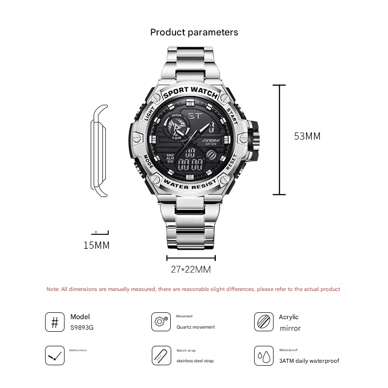 Make a bold statement with the Sinobi Men's Digital-Analog Sports Watch, crafted for those who value both form and function. Featuring a large 53mm round dial with dual display (pointer + number), this timepiece blends classic and modern design effortlessly.