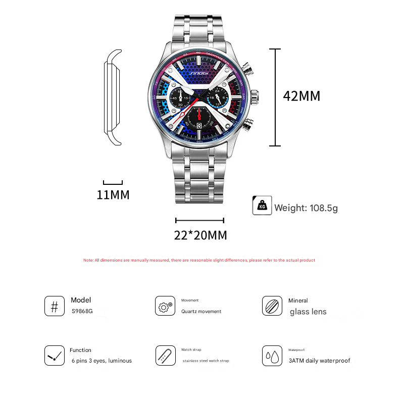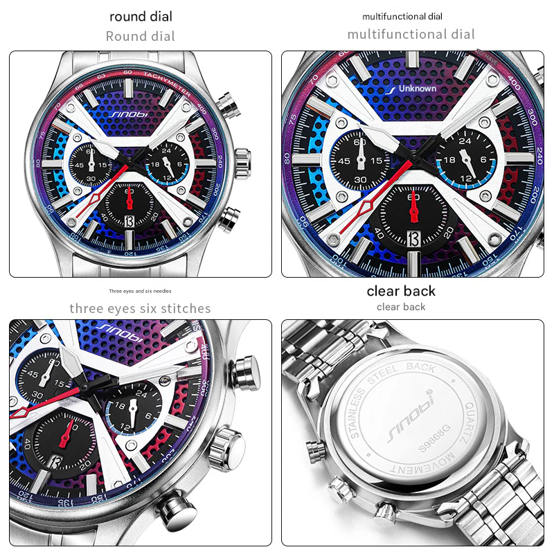 Stay stylish and punctual with this Sinobi men's quartz chronograph watch, designed for business and everyday wear. The 42mm round dial features a sophisticated three-eye six-pin design with luminous hands and markers for easy reading in low light.