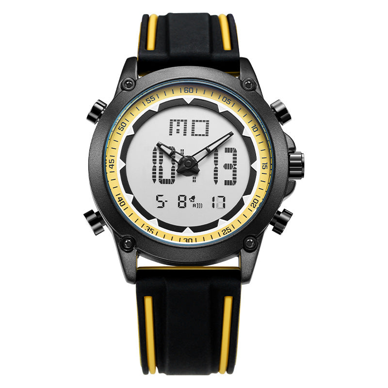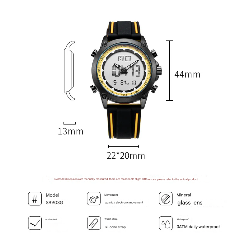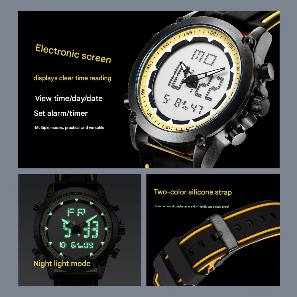 It includes a luminous display, alarm clock, and precise quartz movement, all housed in a rugged 43.5mm alloy case with a sleek round dial. The screw-down crown and mineral-reinforced glass ensure long-lasting durability, while the comfortable fit and modern design make it a go-to for sporty, on-the-go individuals.