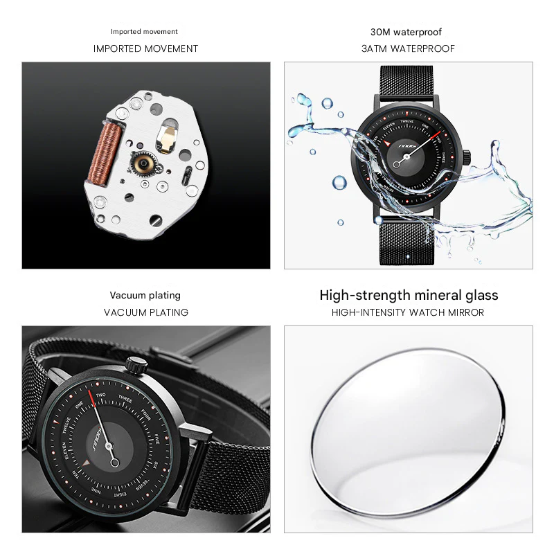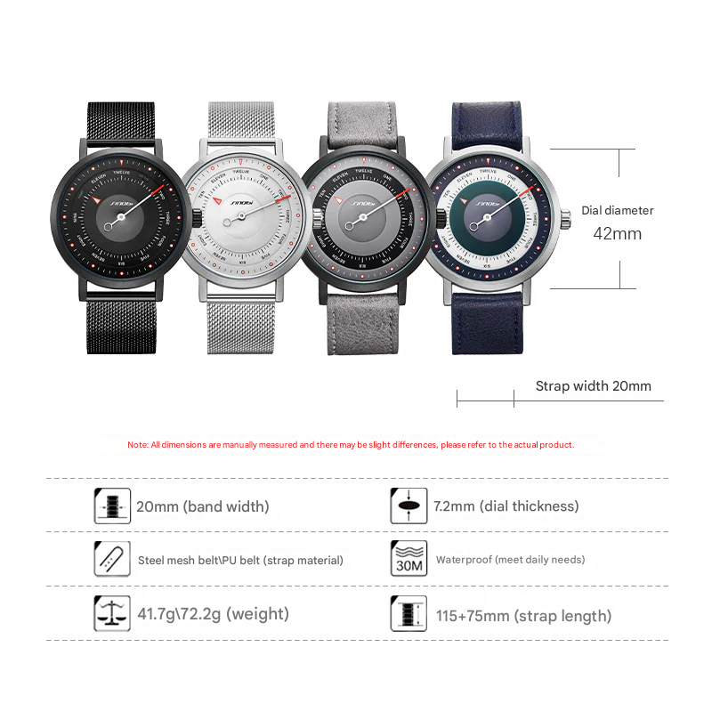 Elevate your everyday look with this men's fashion quartz watch, crafted for students, trendsetters, and active lifestyles. Featuring a sleek 42mm round alloy case, this timepiece boasts a 30M waterproof rating and a durable stainless steel mesh strap with a secure one-piece buckle.