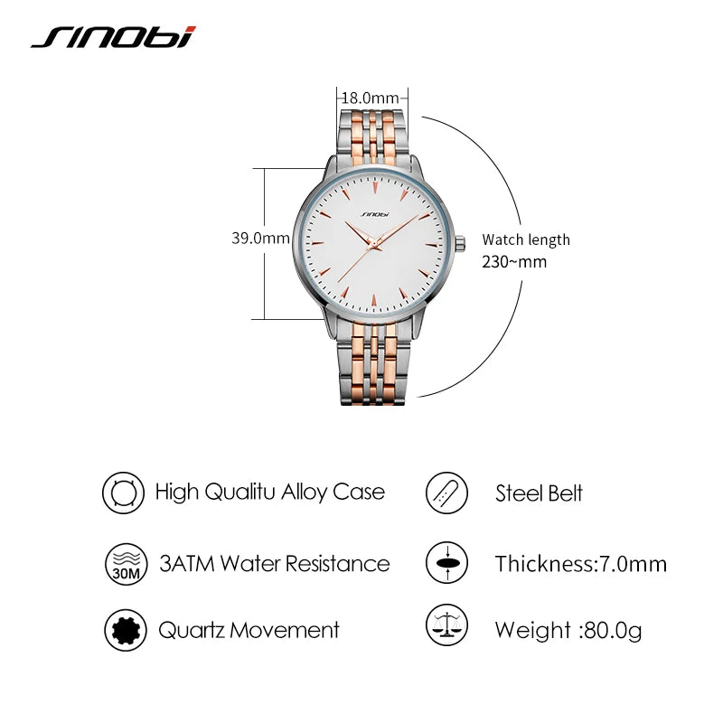 Elevate your everyday style with the Sinobi Men's Stainless Steel Quartz Watch — where modern elegance meets reliable performance. Designed with a 39mm round dial and a durable stainless steel band, this watch delivers a sleek, professional look ideal for business or formal wear.