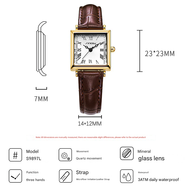 Chic and compact, this Sinobi women's square dial quartz watch brings effortless style to any look. Featuring a sleek 23x23mm dial and a soft microfiber leather strap, this watch offers a refined balance between modern elegance and classic appeal.