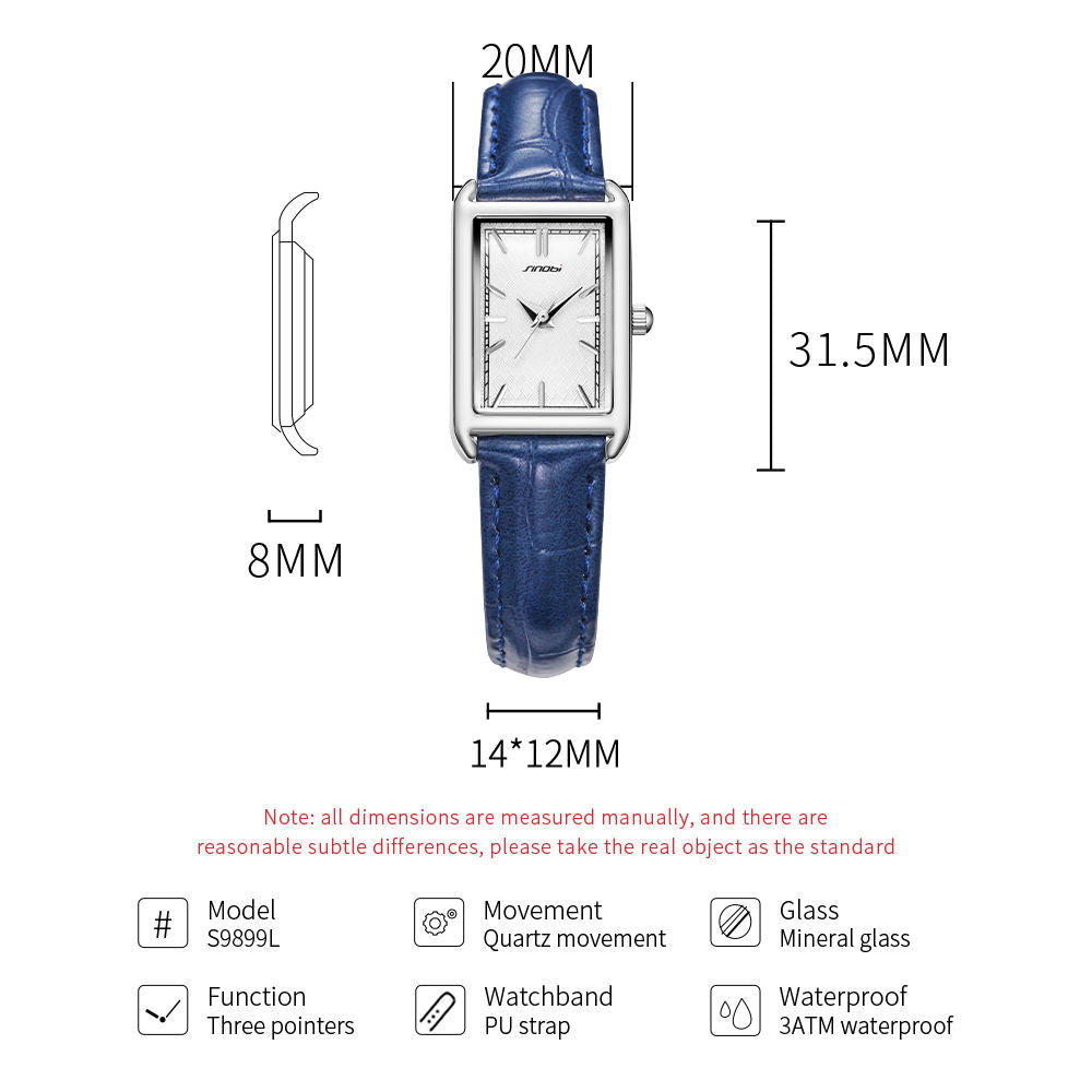 Add a touch of timeless elegance to your everyday look with this women's waterproof quartz watch, featuring a sleek rectangular dial (20×31.5mm) and a soft imitation leather strap. Designed with minimalist charm and lightweight comfort in mind, this 8.0mm slim-profile watch suits both student and casual wear effortlessly.