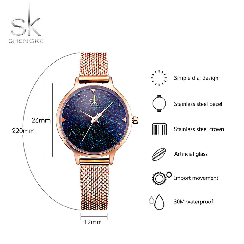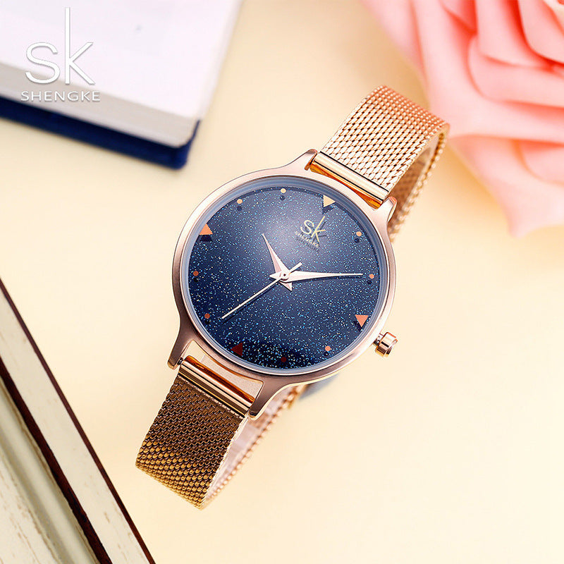Shine with elegance and charm wearing this starry sky women’s quartz watch, designed to bring a touch of sparkle to your everyday style. The 32mm round dial features a stunning starry design under mineral glass, creating a fashionable yet timeless look. Its slim 8.5mm profile and rose gold-black alloy case make it both lightweight and eye-catching, perfect for daily wear or evening outings. The mesh-style alloy strap with a stainless-steel hanging buckle ensures comfort and a secure fit, while the 30M water resistance adds durability for everyday use. Powered by reliable quartz movement, it delivers precise timekeeping so you stay on schedule with style. Handpicked from Abroad, this fashionable wristwatch is a must-have accessory for women who want to blend sophistication with a unique celestial-inspired design.