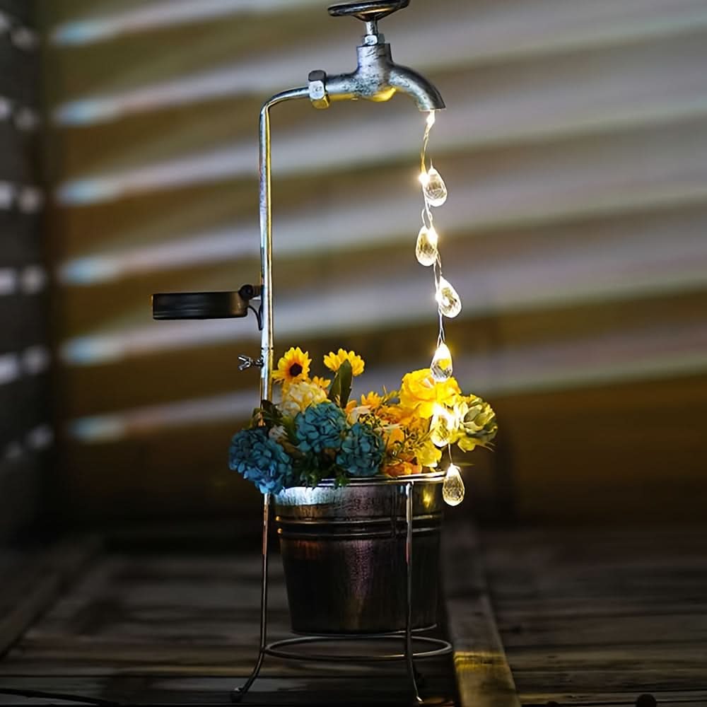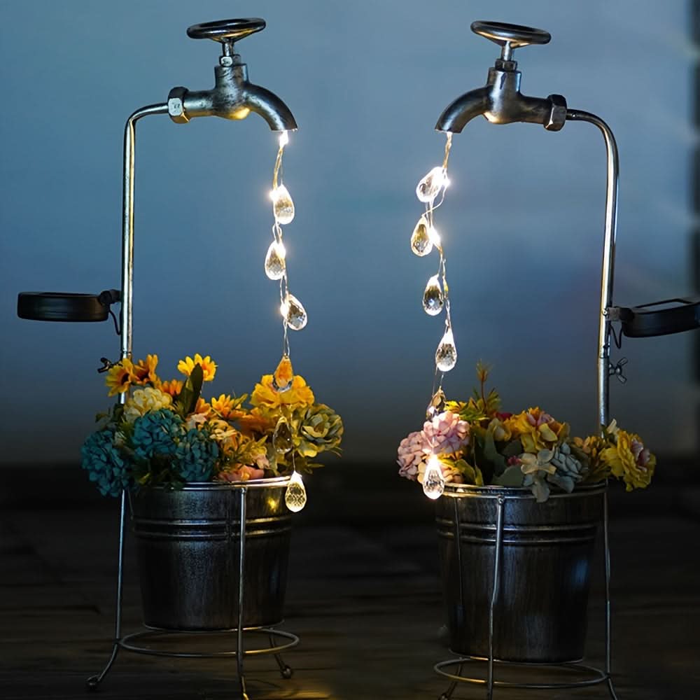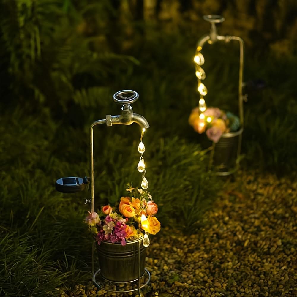 Add a whimsical touch to your garden or patio with this solar-powered LED faucet light, designed to mimic a sparkling water droplet effect. Crafted from durable iron with a matte finish, this unique outdoor light harnesses solar energy, charging by day and casting a soft, inviting glow at night—no wiring needed. The energy-efficient LED light source provides a steady, single-color illumination, perfect for enhancing garden paths, lawns, and patios with a touch of charm. Ideal for eco-conscious homeowners, this decorative solar light is both sustainable and low-maintenance, featuring a built-in solar battery that offers reliable nightly lighting. Elevate your outdoor decor with this delightful, water-inspired fairy light that’s easy to install and sure to captivate guests.