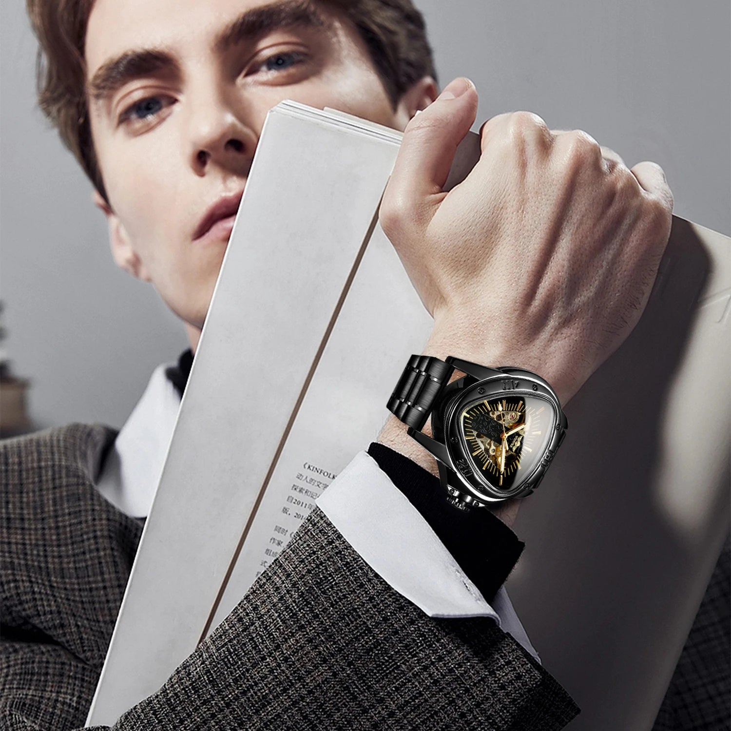 Stand out with the T-Winner Men’s Automatic Mechanical Triangle Watch, a bold and stylish timepiece designed for modern men. Its unique triangular alloy case and stainless steel strap give a contemporary edge, while the luminous hands ensure clear readability in any lighting. Measuring 44.8mm in diameter with a 15.6mm thickness, this watch exudes presence and sophistication. The automatic mechanical movement provides precise timekeeping without the need for batteries, making it both practical and reliable. Handpicked from Abroad, this watch represents international quality and craftsmanship, perfect for fashion-forward individuals who value both aesthetics and performance. Its alarm function adds extra convenience for daily routines, making it suitable for casual, business, or special occasions. With this watch, style and functionality go hand in hand.